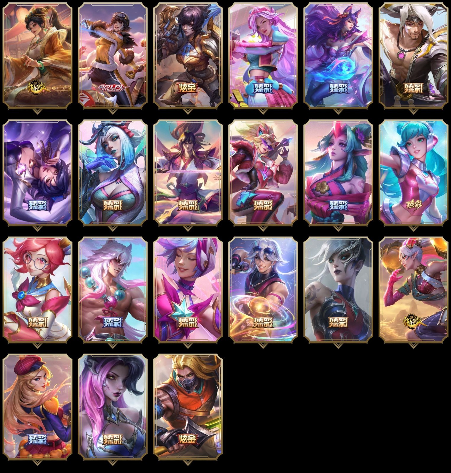 【重要炫彩】古琴余韵娑娜炫金天籁 无畏骑士瑟庄妮赤子初心 冠军之刃锐雯2016 怦然心动凯特琳未相见心已至 灵魂莲华阿狸春晓 灵魂莲华亚索霜见 偶像歌手阿狸极地雪莲 净雪之月莫甘娜冬虹 玉剑传说无影竞星 幻灵战斗蝠薇恩梦幻强袭 天煞劫黑洞 觅心猫猫悠米就想粘你 狗头猫咪悠米要看彩虹 灵魂莲华索拉卡春晓 蔷薇仙灵索拉卡 闪耀灯球拉克丝我又补车了 青花瓷拉克丝含苞 星之守护者娑娜未来之光 奥德赛娑娜恒星游历者 魔女阿狸贪婪 魅惑之月阿狸忠诚 电玩女神卡莎华丽舞步 源计划暗影阿卡丽幻灭 北极星神黛安娜浪漫帘幕 源代码乐芙兰梦幻闪击 西部魔影大小姐蕾欧娜忠诚 光明骑士奎因诡秘守望者 破败军团希瓦娜灵岛征伐使 黎明使者薇古丝霞辉 绝息圣堂弗拉基米尔残阳圆舞曲 波江星神弗拉基米尔美神星魂 咖啡甜心弗拉基米尔酒醉樱桃 真实伤害艾克天纵之才 末世天使凯尔美德之翼 山海绘卷莉莉娅湘妃 灵魂莲华瑟提春晓 可爱可爱粉红红提莫 五杀摇滚之噪音佛耶戈迷幻 奥德赛亚索恒星游历者 地狱火阿木木阿米的学徒 霸天龙神奥瑞利安索尔华天 焰执事布兰德幻魅 黑帮管家布隆造梦大师 宇航员库奇万有引力 地狱火加里奥骄傲之焰 黑夜使者内瑟斯夕夜 黯晶巨鳄雷克顿凝结之梦 串烧大师兰博免费果汁机桃汁 泳池派对璐璐笨笨暹罗猫 勇者阿狸炫金 偶像歌手阿狸幻紫罗兰 花仙子萨勒芬妮玫瑰水晶眼 永恒之森阿狸灿樱之尾 星之守护者奥莉安娜未来之光 冲击之刃劫风魔上忍 2023全球总决赛雷克顿百炼成金 暗影沃里克至真至诚 黑色荆棘莫甘娜马樱丹 咖啡甜心璐璐酒醉樱桃 光明哨兵薇恩都市抗击者 心之钢伊泽瑞尔天纵才华 魔女阿卡丽虚荣 天龙之子卡莎飞龙乘云 怦然心动凯特琳克制亦是放肆 魔女阿狸饕餮 墨之影武者亚索金墨耀影