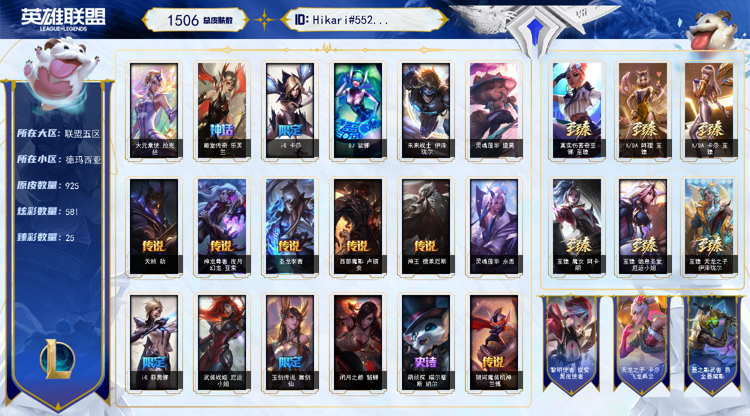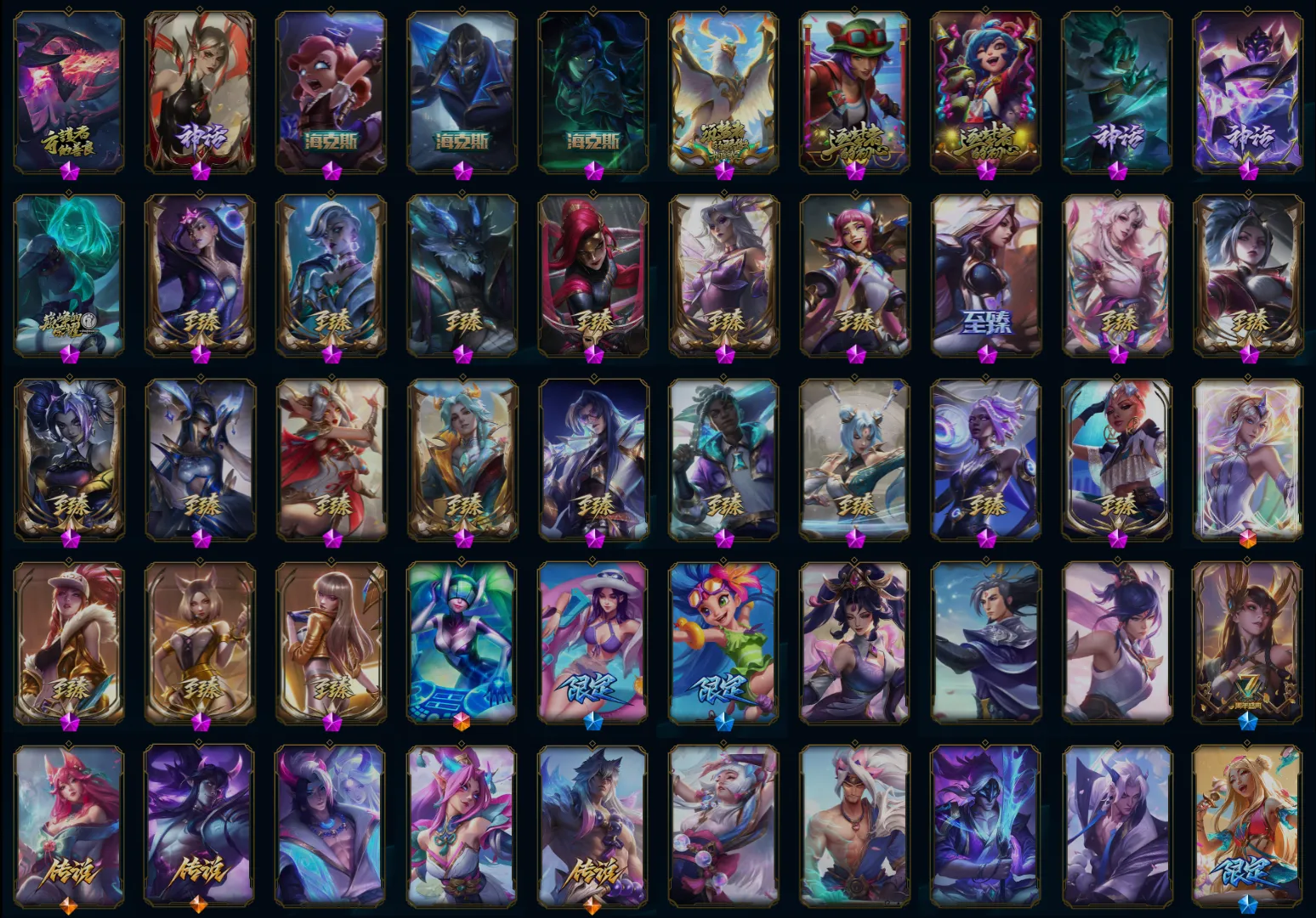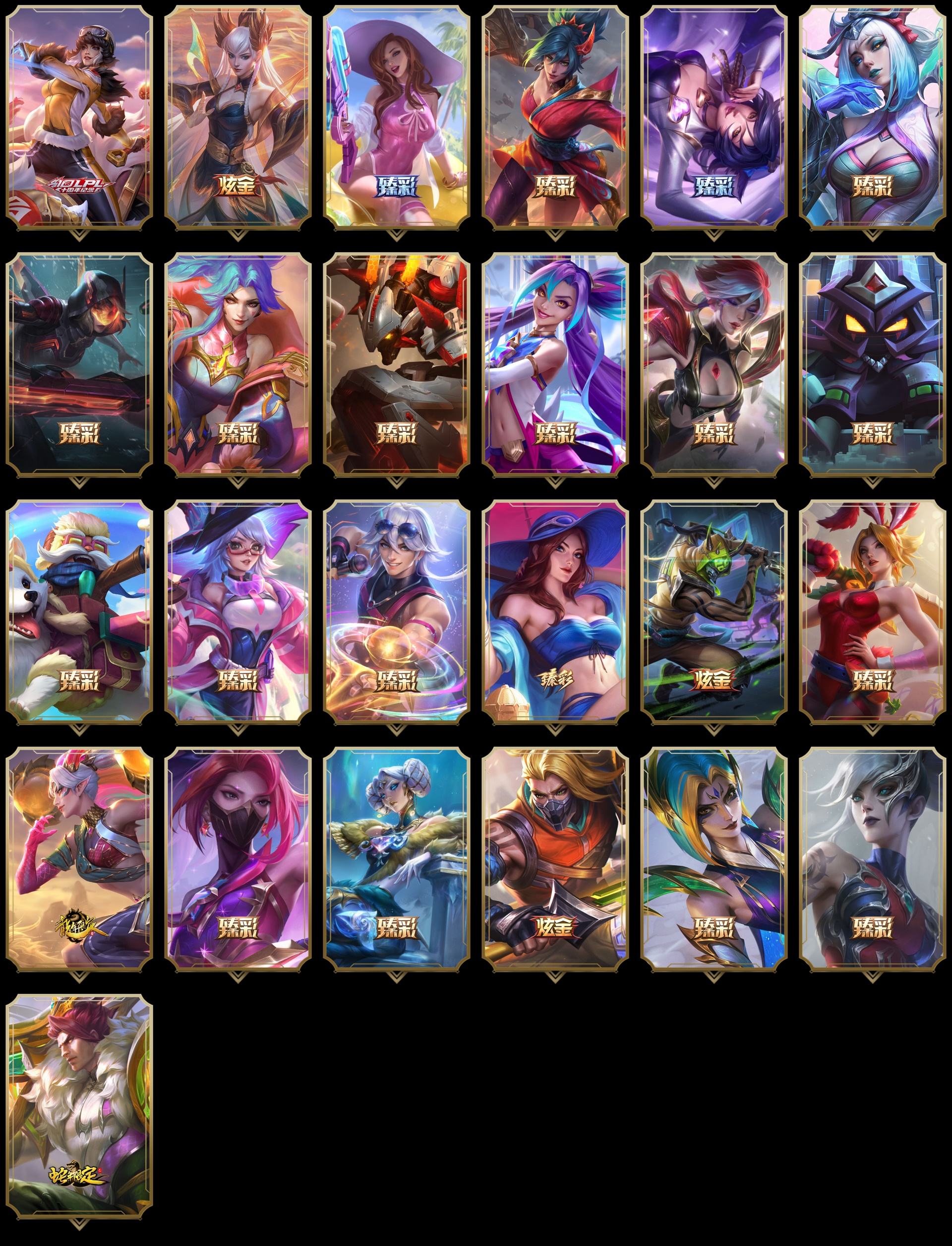 【重要皮肤】灵魂莲华拉克丝至臻 黑色玫瑰假面舞会卡特琳娜至臻 暗星女王黛安娜至臻 魔域梦魇泽丽至臻 天龙之子伊泽瑞尔至臻 北极星钢影卡蜜尔至臻 心之钢永恩至臻 魔女阿卡丽至臻 玉剑传说琴仙子至臻 花仙使者卡特琳娜至臻 绝息圣堂厄运小姐至臻 青花瓷丽桑卓至臻 北极星使者沃里克至臻 星之守护者艾克至臻 月蚀骑士赛娜至臻 幻灵战斗猫金克丝至臻 神凰行者烈羽焰凰霞至臻 KDA一代卡莎至臻 KDA阿狸至臻 KDA阿卡丽至臻 真实伤害奇亚娜至臻 真实伤害奇亚娜2022至臻 殿堂传奇乐芙兰 水晶巫灵泽拉斯 海克斯科技安妮 水晶圣骑塔莉垭 暗星科加斯 摄魂使者薇恩 胜利剑圣易 胜利女神娑娜 胜利之王泰达米尔 荣誉使者玛尔扎哈 电玩勇者锐雯 电玩女神阿狸 星之守护者伊泽瑞尔 玉剑传说舞剑仙 女帝厄运小姐 玉剑传说神机花火 星之守护者佐伊 黎明使者薇恩 点心宝贝阿木木 天龙之子斯莫德 剪纸仙灵盖伦 神龙烈焰金克丝 古琴余韵娑娜 玉净夜叉凯特琳 烈焰美人薇恩 胜利女神奥莉安娜 胜利枪神格雷福斯 胜利枪神卢锡安 胜利之剑亚托克斯 怦然心动凯特琳 幽梦玫瑰伊莉丝 碎心之拳蔚 甜心之羽霞 甜心宝贝娑娜 穿心之剑菲奥娜 觅心魔灵奥莉安娜 觅心女王艾希 觅心之翼奎因 觅心萝莉金克丝 幽梦玫瑰辛德拉 幽梦玫瑰泰隆 水晶玫瑰斯维因 北极星神黛安娜 北极星猎人斯维因 冬境仙灵索拉卡 寒冬精灵璐璐 冬季仙境奥莉安娜 雪球也能爆炸吉格斯 圣诞捣蛋鬼金克丝 圣诞老人德莱文 冰雪驯鹿波比 冰雪风暴希维尔 冬季仙境卡尔玛 持胡萝卜的雪人易 狂心冰王图奇 冰雪女神辛德拉 魄罗骑士瑟庄妮 夺命美人卡特琳娜 平安夜女神娑娜 魅惑女巫莫甘娜 魅惑女巫崔丝塔娜 魅惑女巫奈德丽 大魔王提莫 死亡誓约卡特琳娜 死亡誓约劫 死亡誓约维克托 灵魂收割者索拉卡 小恶魔菲兹 海之歌奈德丽 海之歌萨勒芬妮 泳池派对凯特琳 泳池派对佐伊 泳池派对厄运小姐 泳池派对塔里克 泳池派对菲奥娜 泳池派对格雷福斯 泳池派对蕾欧娜 泳池派对布隆 电玩战魂赫卡里姆 御星魔矢艾希 克格汪 DRX阿卡丽 EDG厄斐琉斯 EDG格雷福斯 EDG佐伊 DWG蕾欧娜 FPX墨菲特 iG卡蜜尔 iG洛 iG卡莎 iG艾瑞莉娅 iG乐芙兰 iG菲奥娜 SSG霞 SSG洛 SSG纳尔 SSG塔莉垭 SSG嘉文四世 SSG伊泽瑞尔 SKTT1扎克 SKTT1辛德拉 SKTT1娜美 SKTT1卡莉丝塔 SKTT1瑞兹 SKTT1伊莉丝 SSW锤石 SSW雷恩加尔 SSW图奇 SSW辛吉德 SKTT1劫 SKTT1婕拉 SKTT1李青 暗杀星奥莉安娜 暗杀星蒙多 暗杀星努努和威朗普 暗杀星慎 Fnatic迦娜 Fnatic库奇 Fnatic古拉加斯 Fnatic卡尔萨斯 冰雪节格雷福斯 冰雪节玛尔扎哈 冰雪节辛吉德 冰雪兽纳尔 防暴士兵格雷福斯 防暴士兵辛吉德 防暴天使凯尔 钢铁之翼艾尼维亚 冠军典狱长锤石 冠军蔷薇乐芙兰 冠军之矛卡莉丝塔 冠军之刃锐雯2016 冠军之血希瓦娜 春晖神女艾希 鬼影森森茂凯 鬼影重重魔腾 海贼瑞兹 红桃杰克崔斯特 胡桃夹子萨科 惊悚派对阿木木 警用试作体K9内瑟斯 蓝色忧郁崔斯特 南瓜头费德提克 女猎手希维尔 圣诞精灵崔丝塔娜 圣诞开心鬼提莫 圣诞狂欢基兰 圣诞狂欢努努和威朗普 圣诞老人古拉加斯 圣诞驯鹿克格莫 糖果使徒费德提克 外星装甲库奇 卧虎藏龙贾克斯 无头骑士赫卡里姆 喜庆之树茂凯 邪恶圣诞老人维迦 幸福女神乐芙兰 雪默丁格 雪装奈德丽 英勇玩具兵普朗克 永恒之森乐芙兰 勇者阿狸 勇者奈德丽 征服者卡尔玛 征服者韦鲁斯 暗影沃里克 冠军之箭艾希 阿木木主人不要我了 波比的巧克力工坊 地底世界崔斯特 都铎王朝图奇 十五周年纪念希维尔 十周年纪念安妮 源代码乐芙兰 神凰行者瑞羽圣凰艾尼维亚 机神玄武盖伦 暗裔英雄盖伦 DJ娑娜 大元素使拉克丝 未来战士伊泽瑞尔 武装战姬厄运小姐 魔女娜美