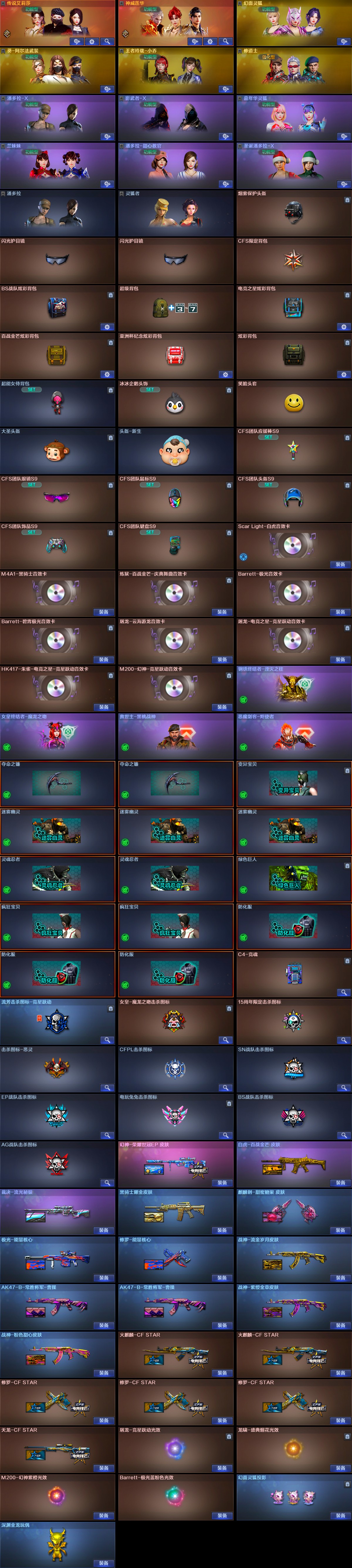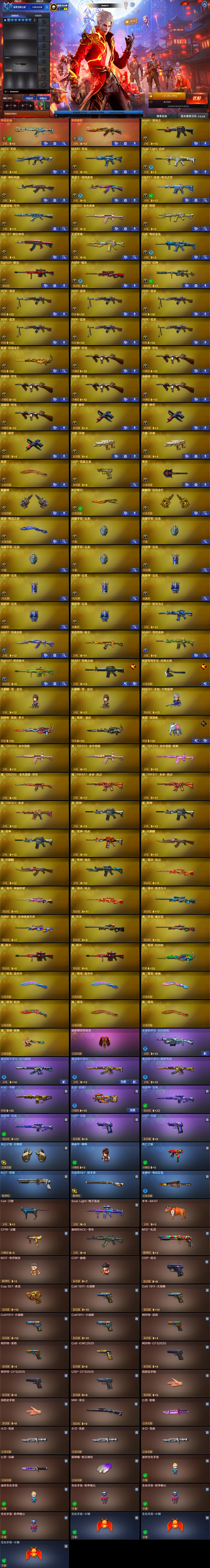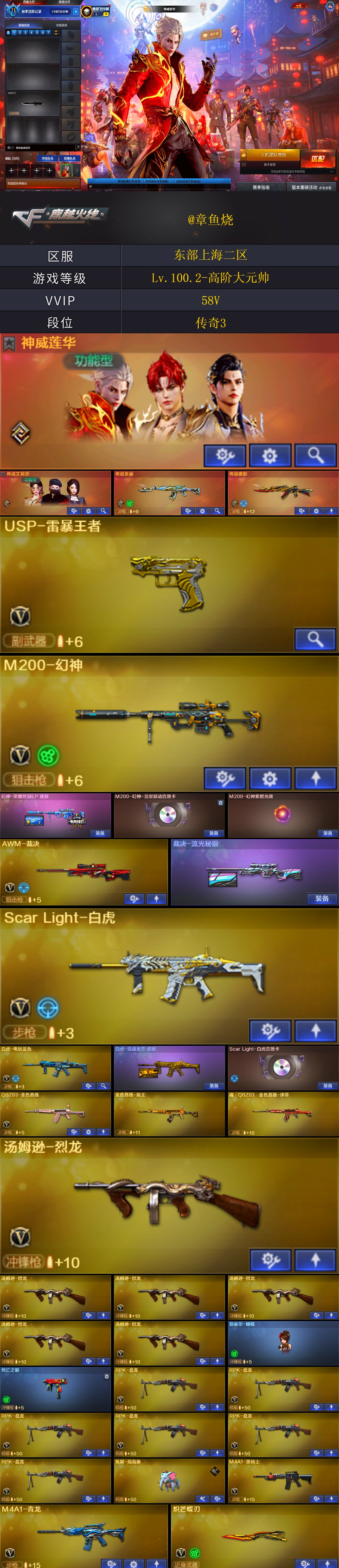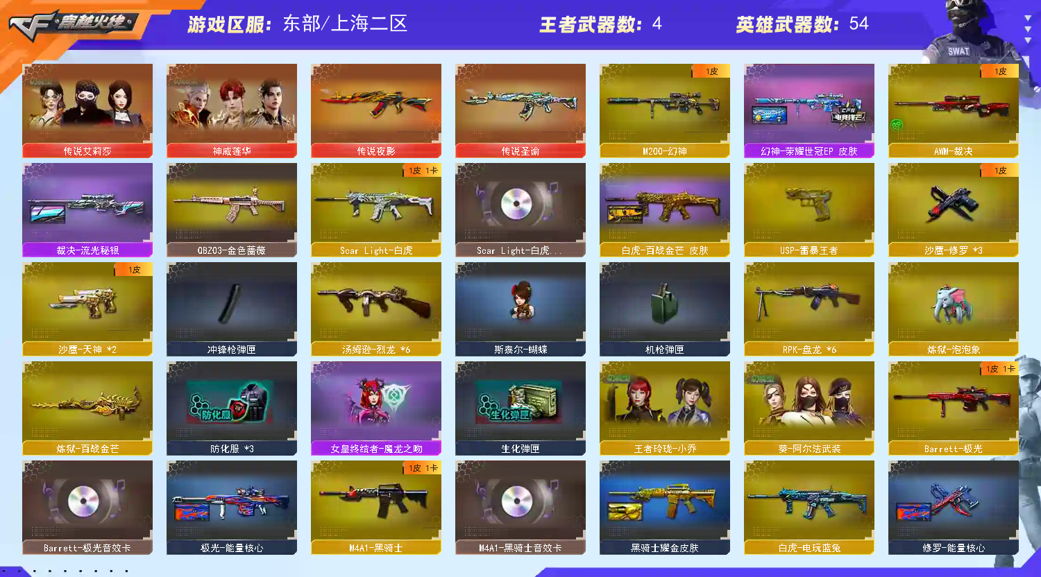 【稀有武器】:传说夜影/M200-幻神/ScarLight-白虎/M4A1-青龙/QBZ03-金色蔷薇/M4A1-黑骑士/白虎-电玩蓝兔/Barrett-极光/AWM-裁决/RPK-盘龙(6)/汤姆逊-烈龙(6)/炽芒蝶刃