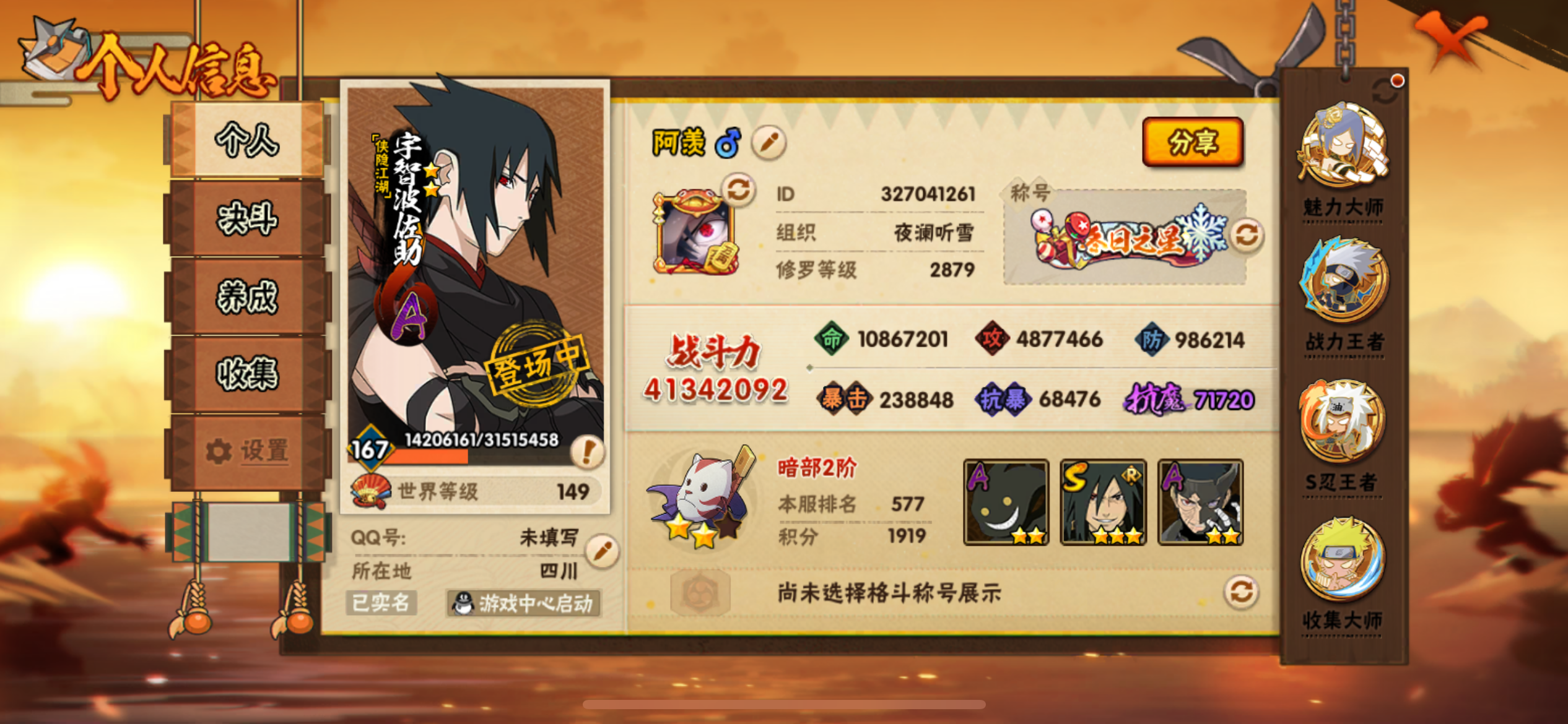 十尾带土🔥4175万战力🔥多场景全通灵全密卷🔥425忍🔥侠影佐助全套高魅号