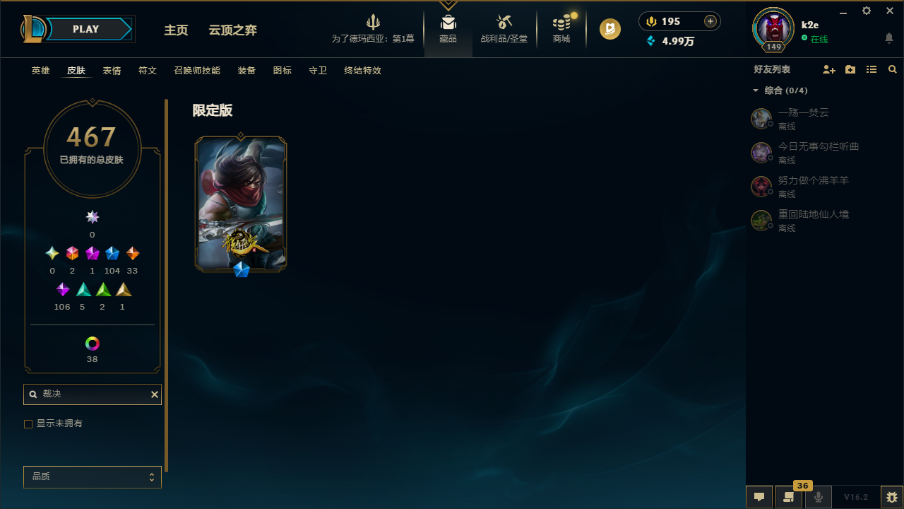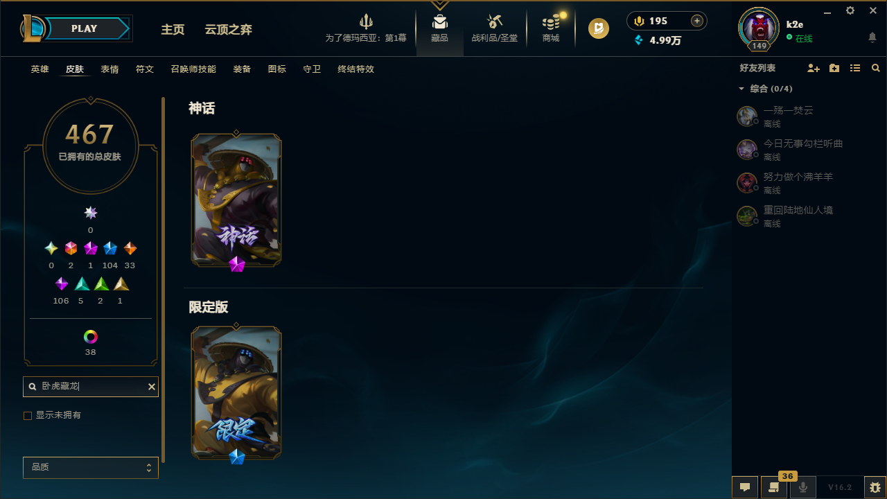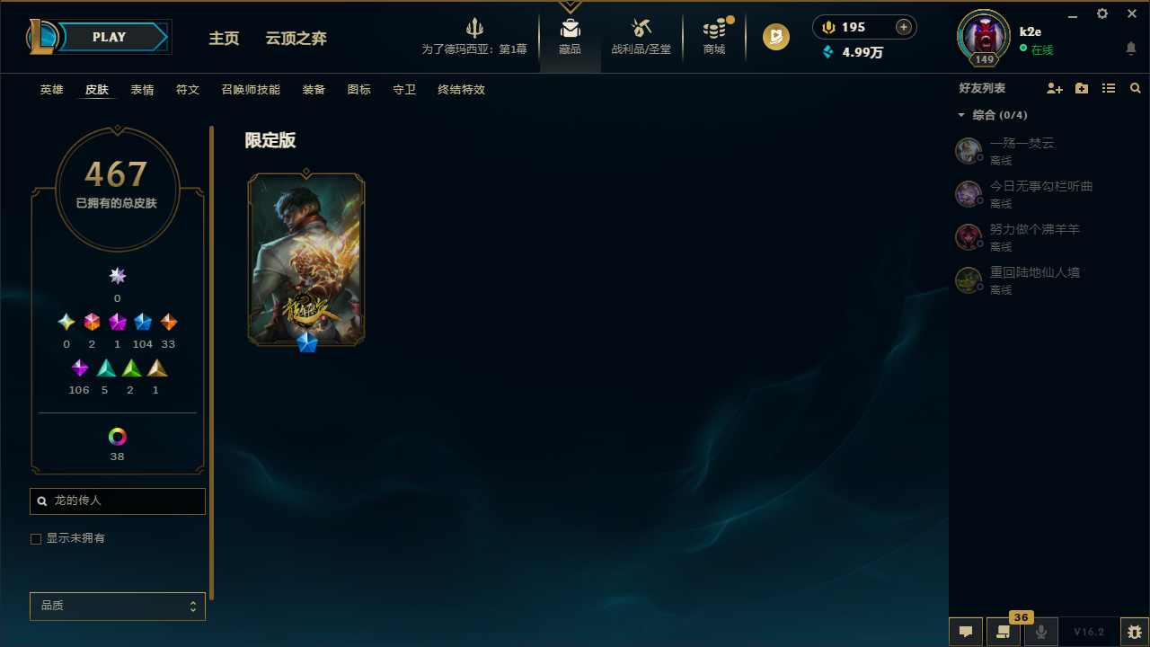 艾欧尼亚500皮丨龙瞎龙刀丨龙猴龙嘴龙琴丨蓝牛黑牛丨奥斯曼蛮王丨勇敢的心诺手丨卧虎藏龙贾克斯