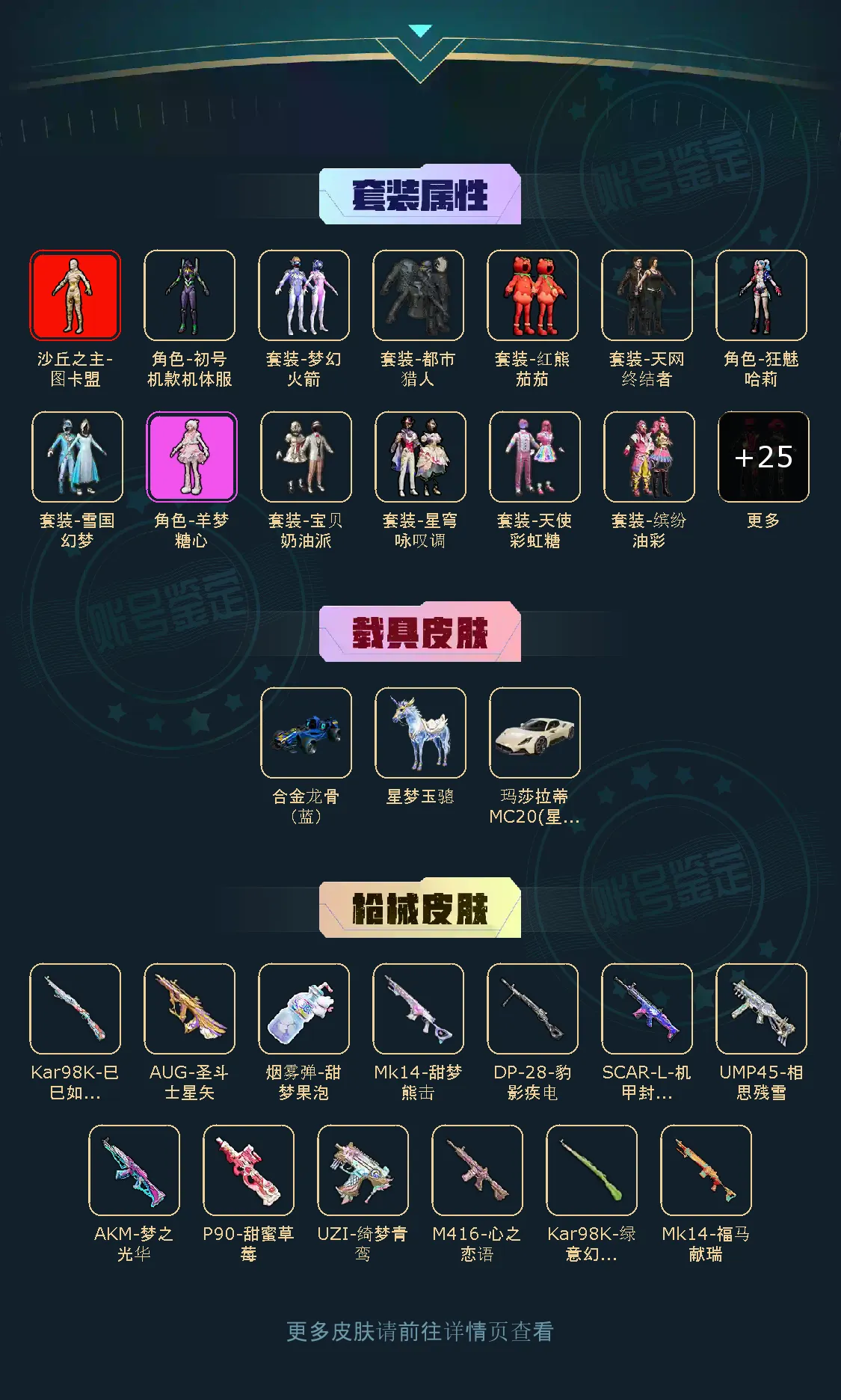 【稀有资产】沙丘之主-图卡盟[3级]/角色-初号机款机体服/套装-雪国幻梦/角色-羊梦糖心/套装-缤纷油彩/AUG-圣斗士星矢/M416-心之恋语/AKM-梦之光华/烟雾弹-甜梦果泡/角色-明日香款战斗服/角色-真嗣款战斗服/套装-都市猎人/套装-天网终结者/套装-胖达圆圆/套装-浪漫天命/套装-龟仙人/套装-迅捷狂鲨/套装-糯粉咩咩/套装-兔兔白日梦/套装-红熊茄茄/套装-墨青刃影/套装-狂沙舞者/角色-粉雾星云/角色-兔兔小魔女/角色-都市丽猫/角色-乐音/角色-银尘