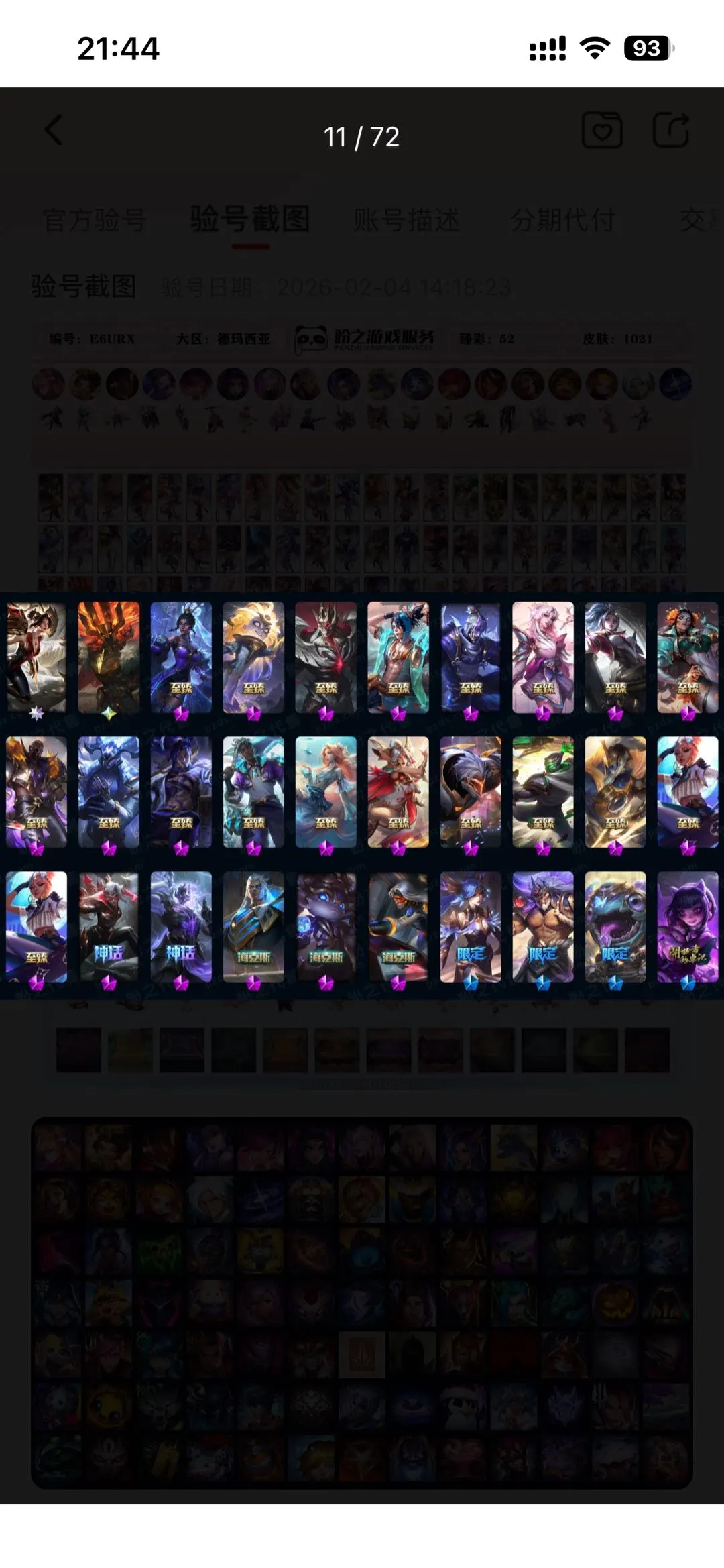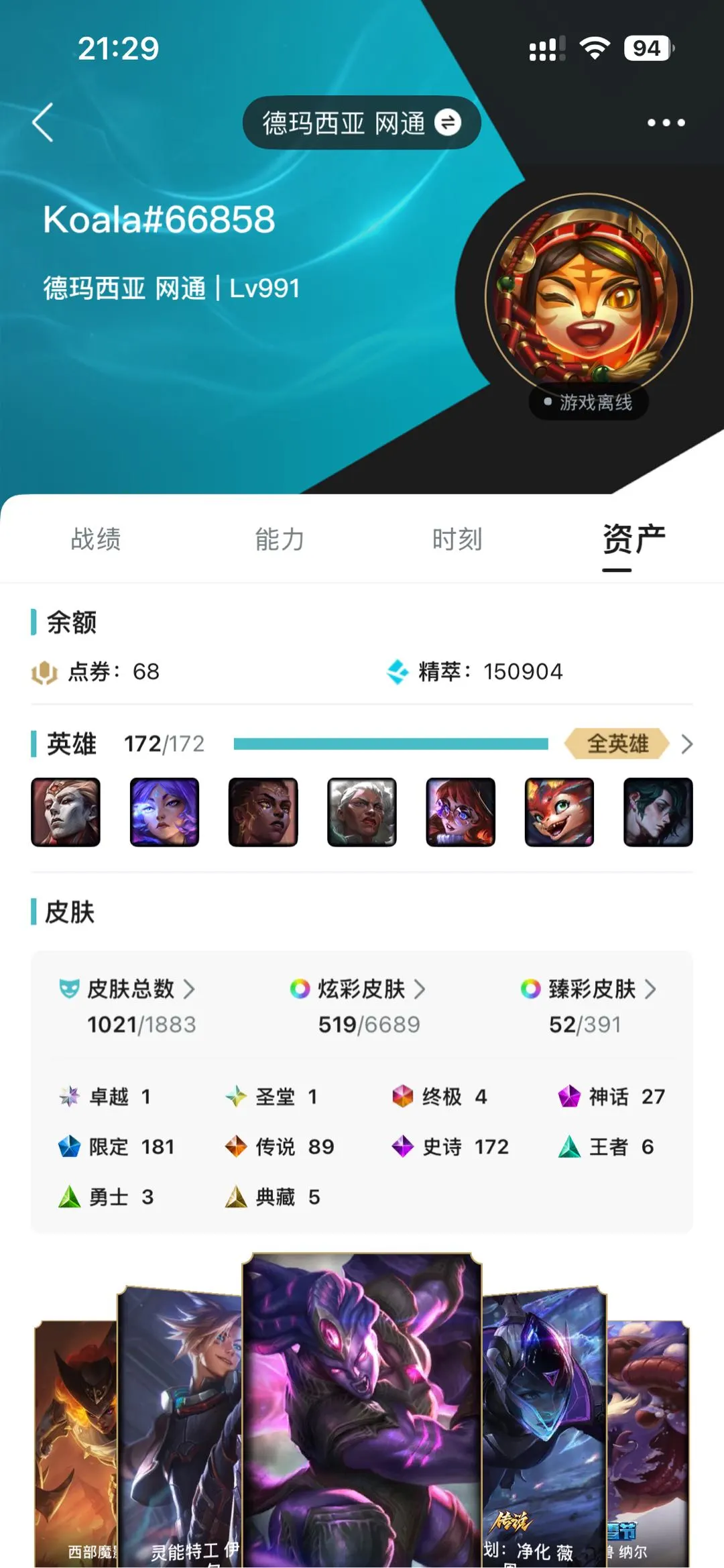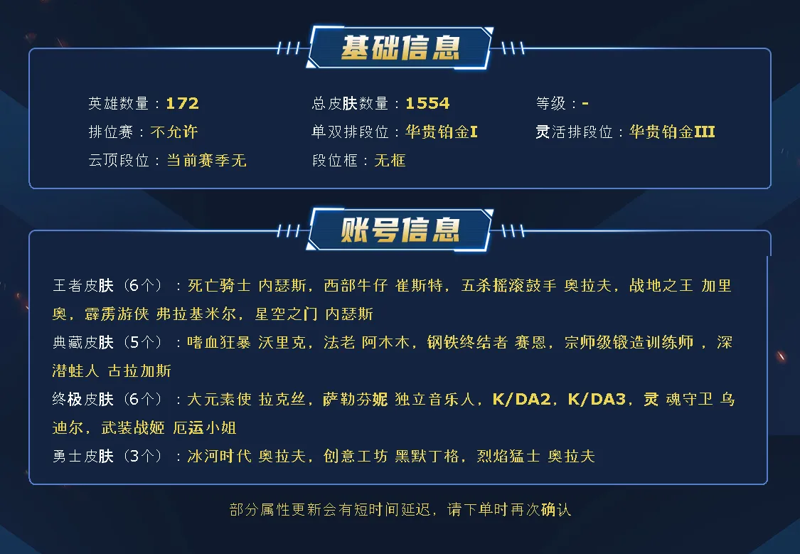 德玛西亚1021原皮,519炫彩,26神话,圣堂铁男,可排位。乱斗开黑。文明游戏,请勿逃跑、秒退、消极游戏。欢迎使用。