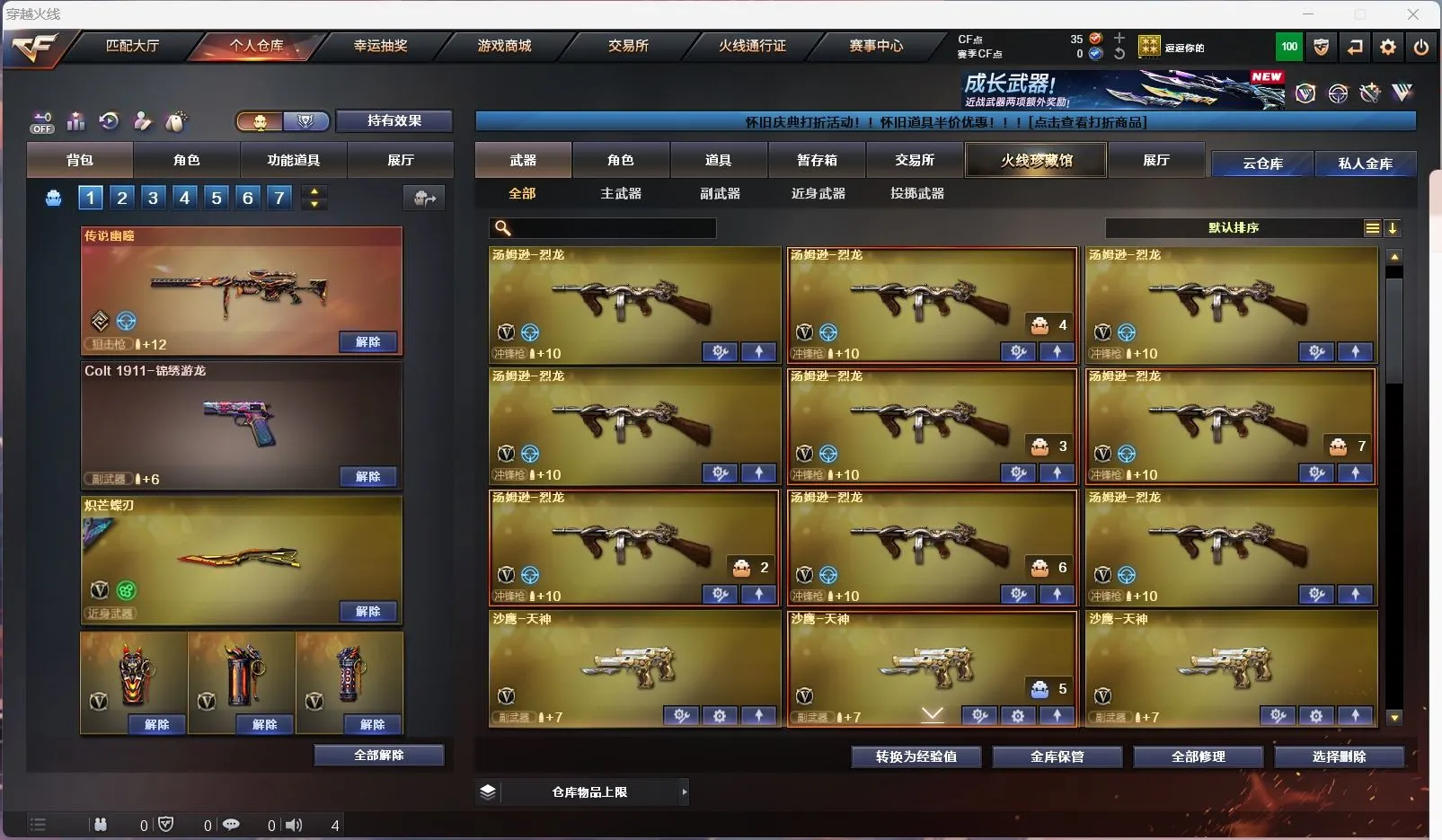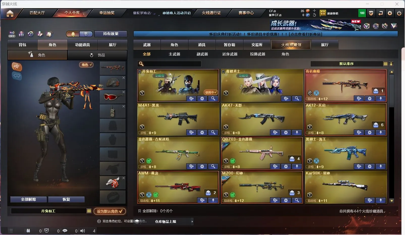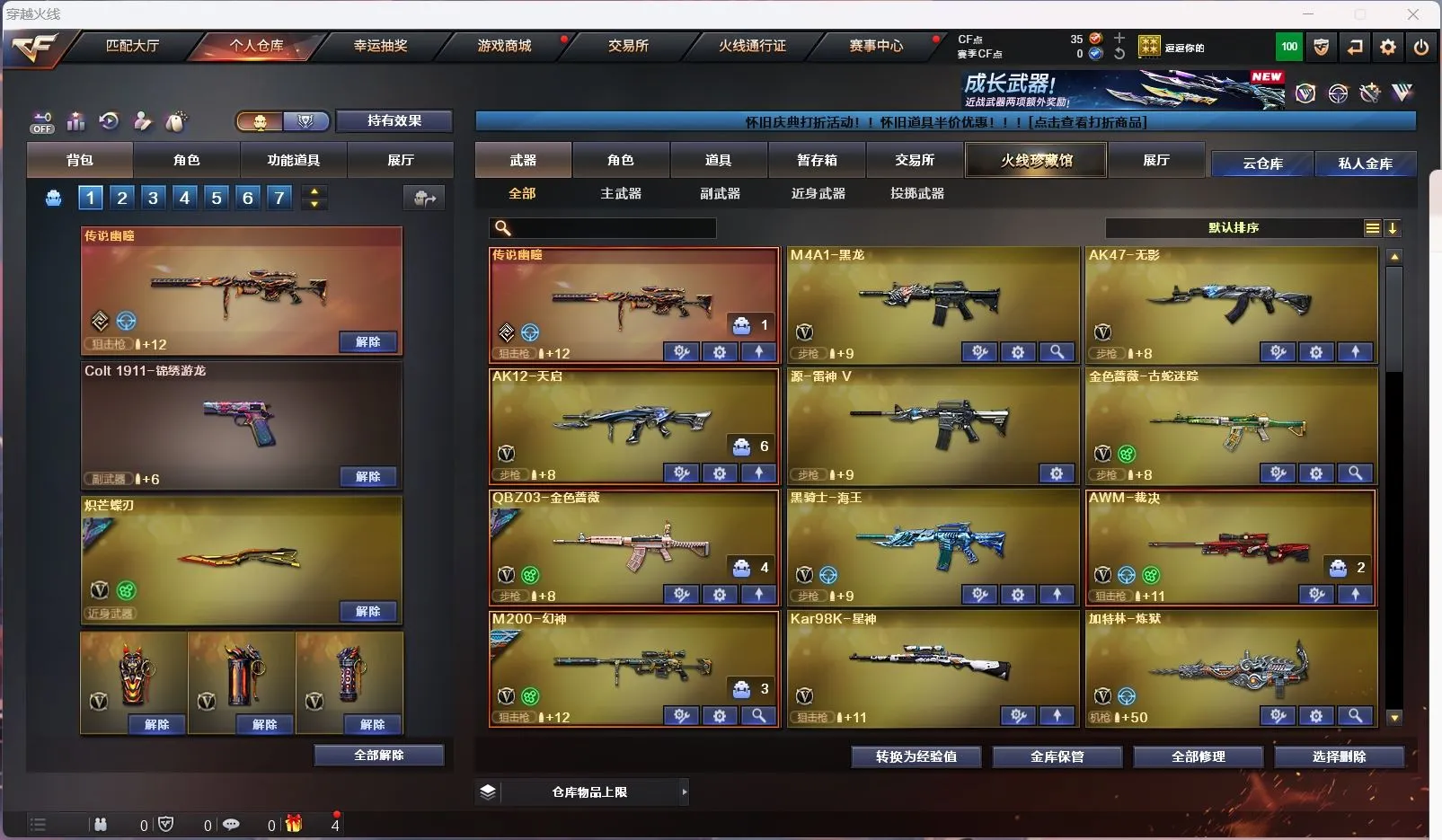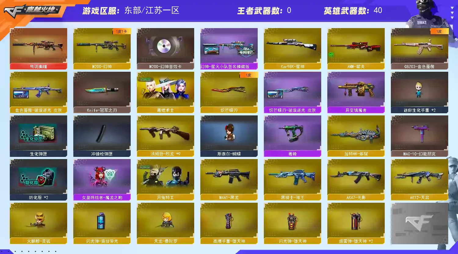 【传说幽瞳 】【m200幻神+幻神音效卡+星火小队 +冠军之刃】【98k星神】【6烈龙 炼狱 斯太尔蝴蝶 】【qbz金色蔷薇+破浪逐光 】【黑龙】【裁决】【炽芒蝶刃+破浪逐光】【武器:海王】【9手枪:天神*8 修罗 】【6刀具:屠龙*3 尼泊尔雷霆 堕天神 】【雷套:堕天神雷】【小人枪:朱雀蛇隐宗 雷神精英刀锋 毁灭孙三炮 天龙曼陀罗 火麒麟灵狐 】【音效卡:幻神音效卡 】【四防角色:毒蝰术士 月兔特工 】