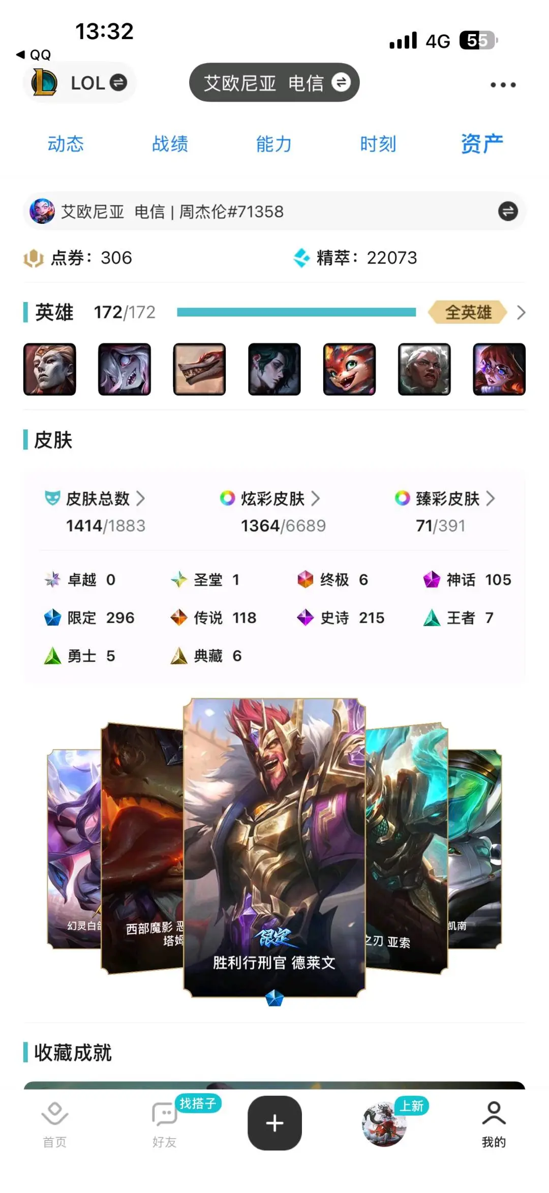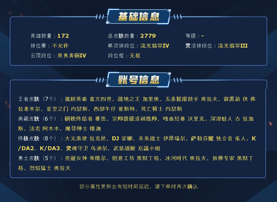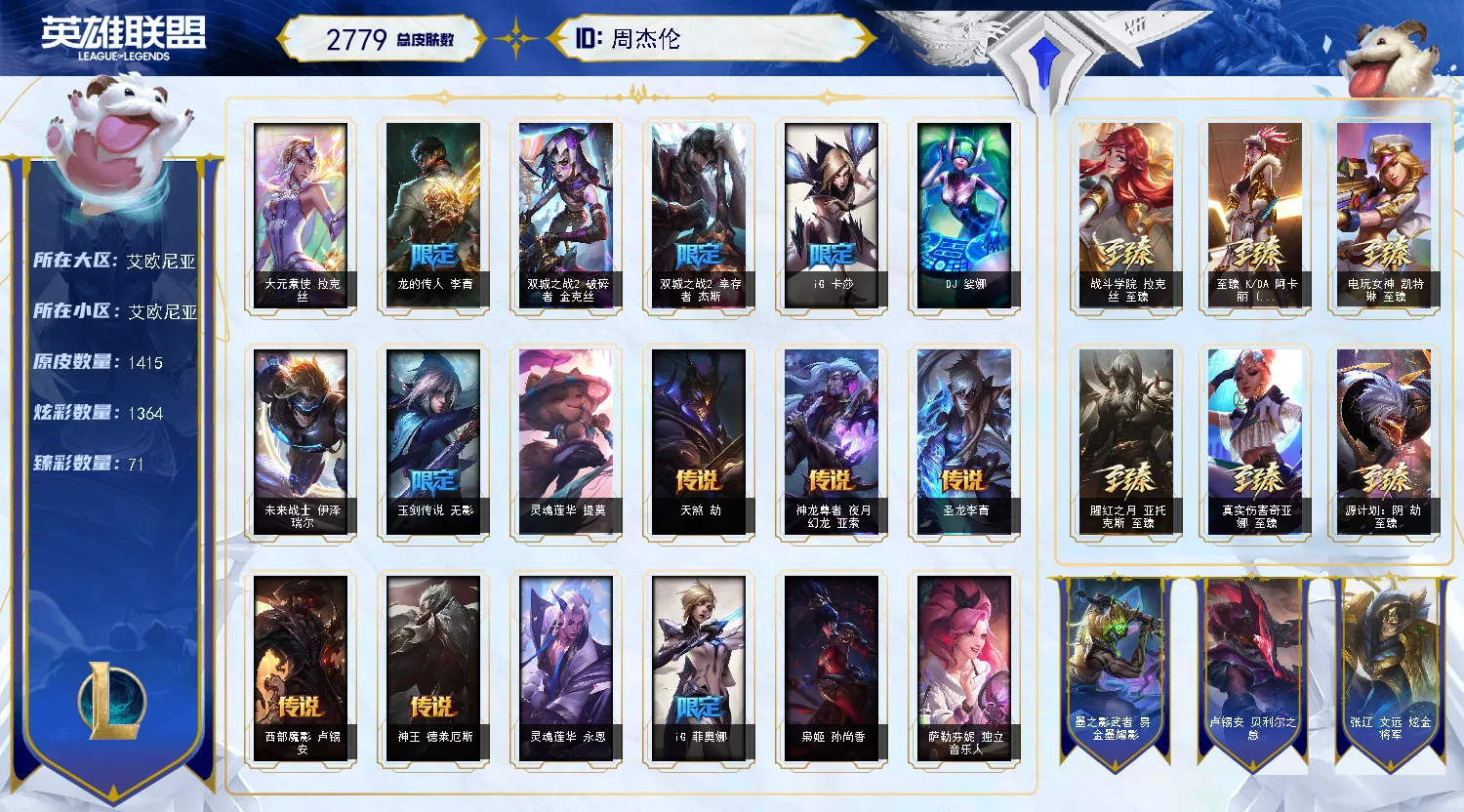 艾欧尼亚2700皮可排位。4色龙瞎,圣堂金克丝,1414原皮,1364多炫彩。296张限定皮。