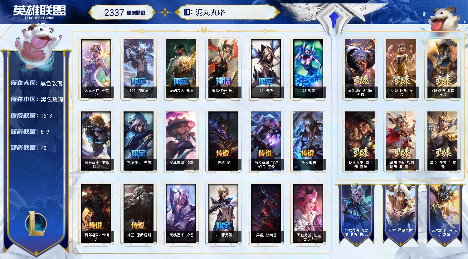 黑色1500原皮号,800张炫彩,318张限定。拥有稀有限定:冰原酒桶、斩星魔剑JS、莲花之令卡尔玛、哥特安妮、机械迷城加里奥、冬季仙境发条、龙瞎龙刀龙猴龙琴龙嘴、花木兰、藏龙卧虎贾克斯、勇敢的心诺手等