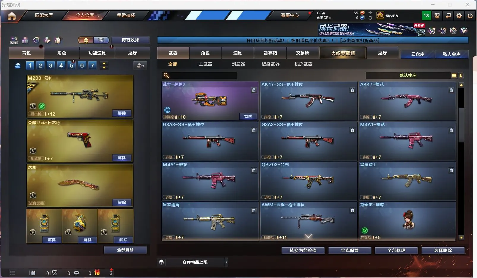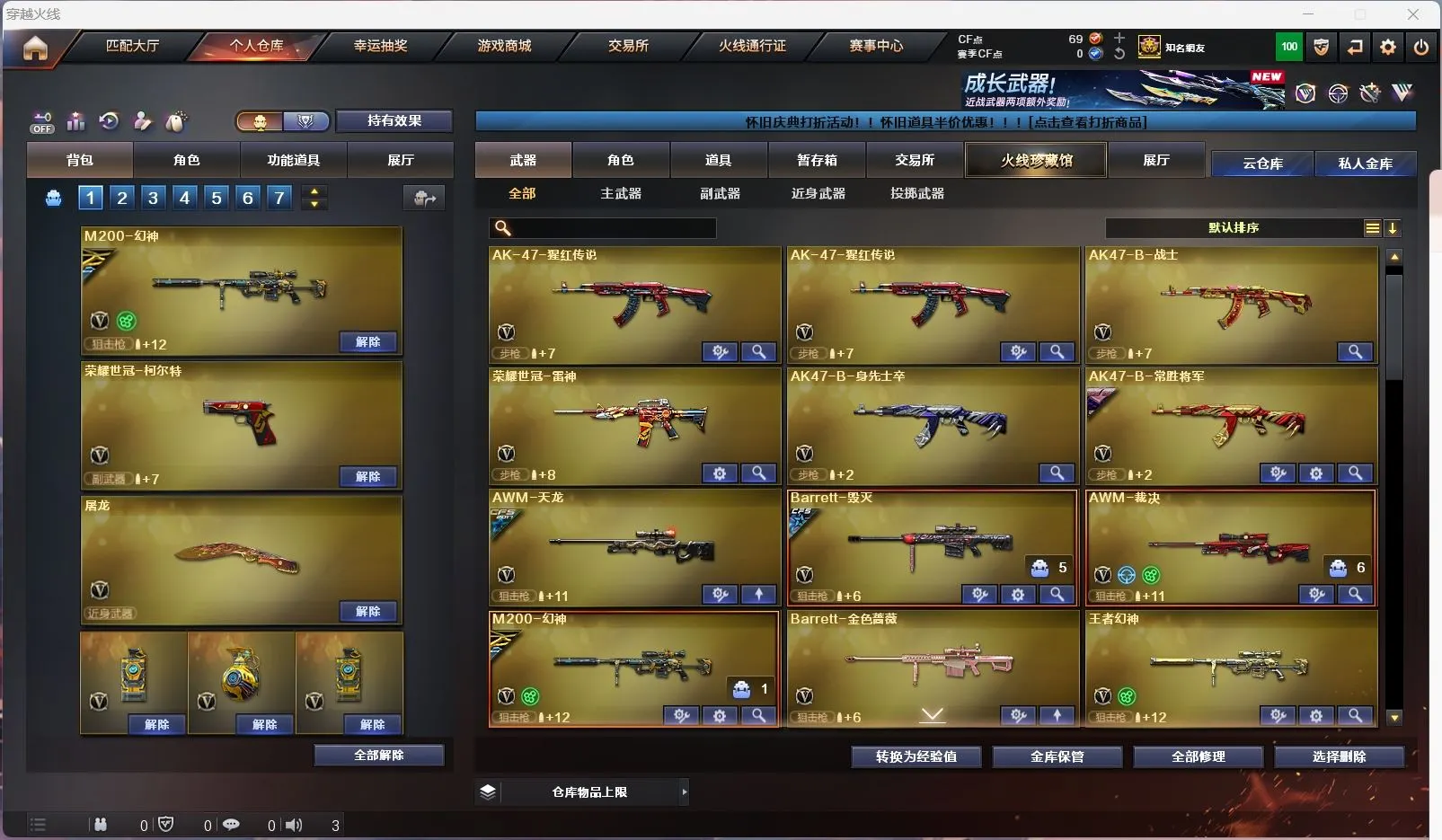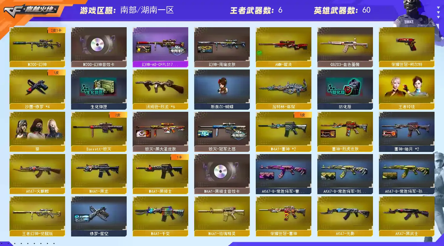 【亮点解析 幻神三件套 生化高配】【m200幻神+幻神音效卡+ag17冠军 +周瑜】【王者幻神】【6烈龙 炼狱 斯太尔蝴蝶 】【qbz金色蔷薇】【火麒麟】【黑龙】【雷神】【黑骑士+卡】【毁灭+cfs2018+冠军之怒】【裁决 】【武器:王者之影 荣耀世冠雷神 】【6手枪:修罗*4 天神 荣耀世冠柯尔特】【10刀具:屠龙*3 擎天*2 麒麟刺 堕天神*2 幻灵之峰 王者之击 】【4雷套:堕天神*2 幻灵雷 雷霆王者】【小人枪:天龙曼陀罗 】【音效卡:幻神音效卡 黑骑士音效卡 】【四防角色:灵动武士