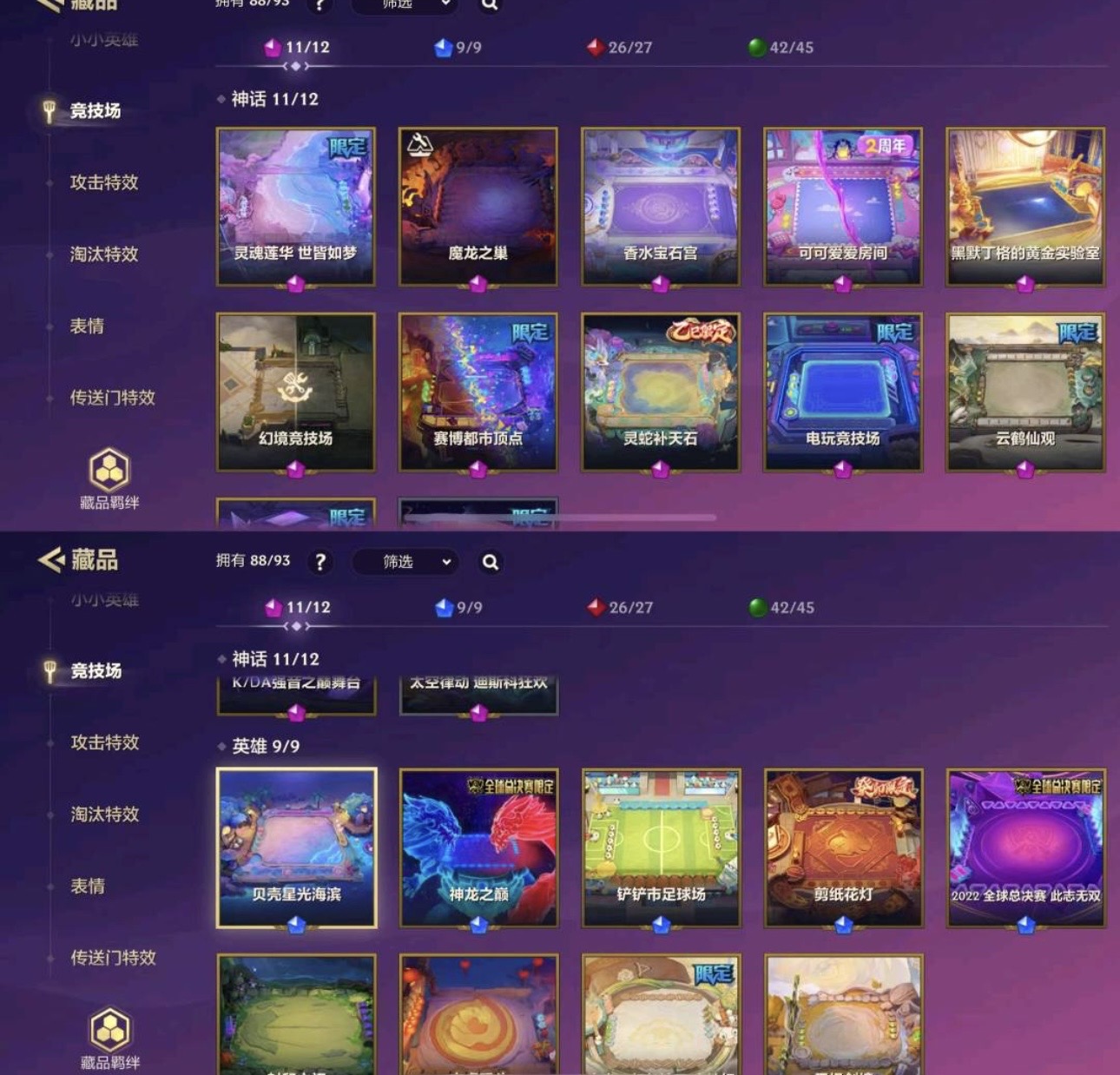 黑默丁格的黄金实验室✅魔龙之巢✅电玩竞技场✅香水宝石宫✅神龙之巅✅铲铲市足球场✅剪纸花灯✅灵蛇补天石✅KDA强音之巅舞台✅大家一起包饺子 竞技场✅无极剑境✅吉虎