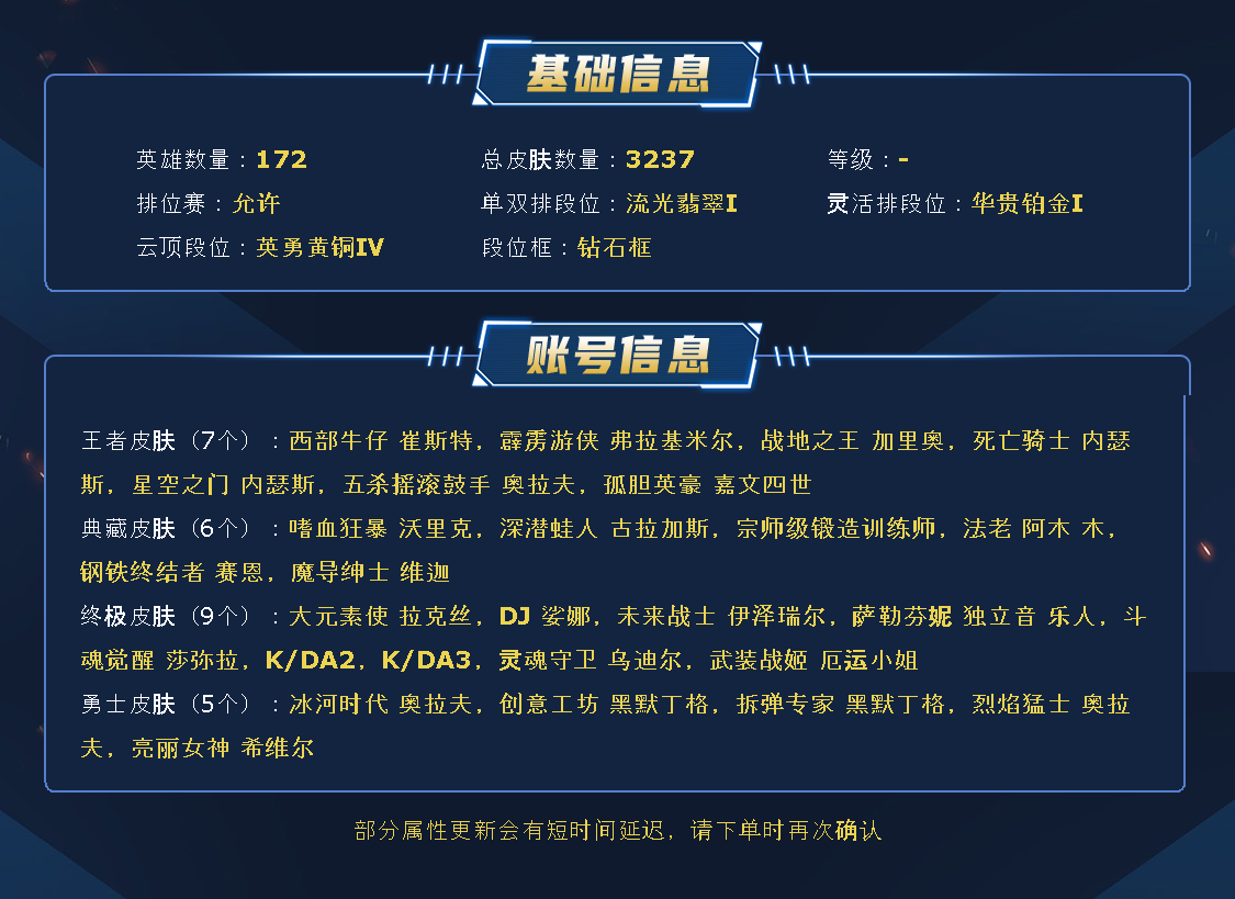 禁止挂机,消极游戏,骂人,谢谢,发现永久拉黑。有最新的龙马烈焰一套,踏雪寻梅一套,凯隐心之钢炫金炫彩金声玉振,安妮游梦仙境,蛮子奥斯曼大帝,冰桶,圣堂铁男,圣堂金克斯,圣堂佛耶戈,名人堂卡莎等大量精品皮肤欢迎体验