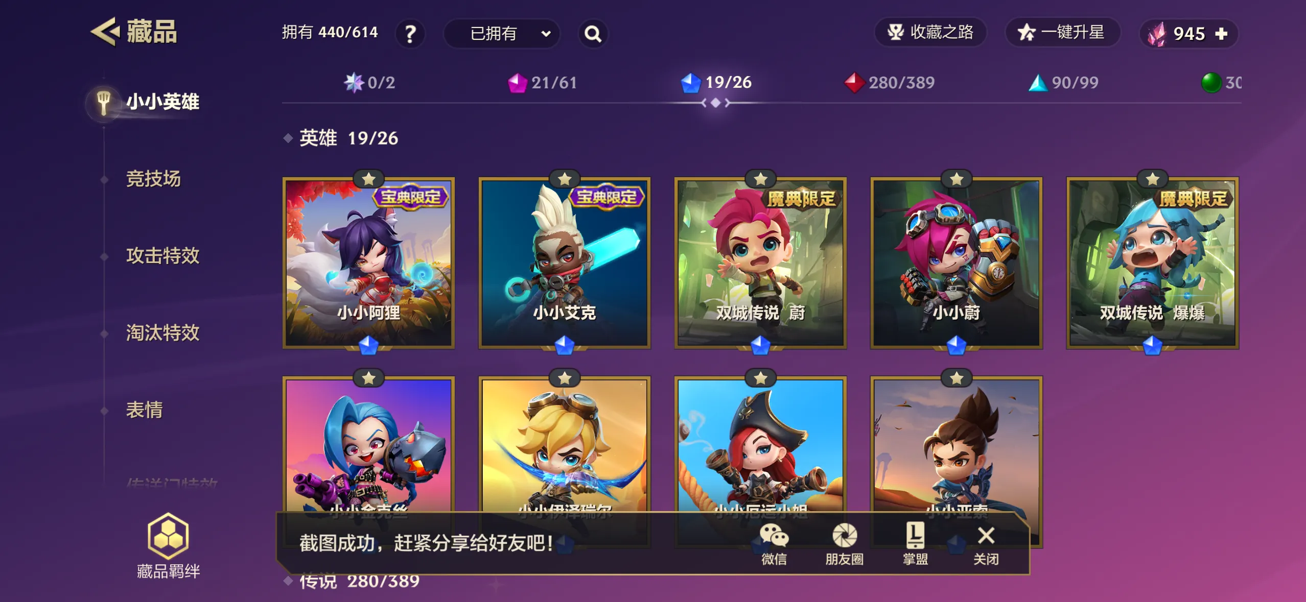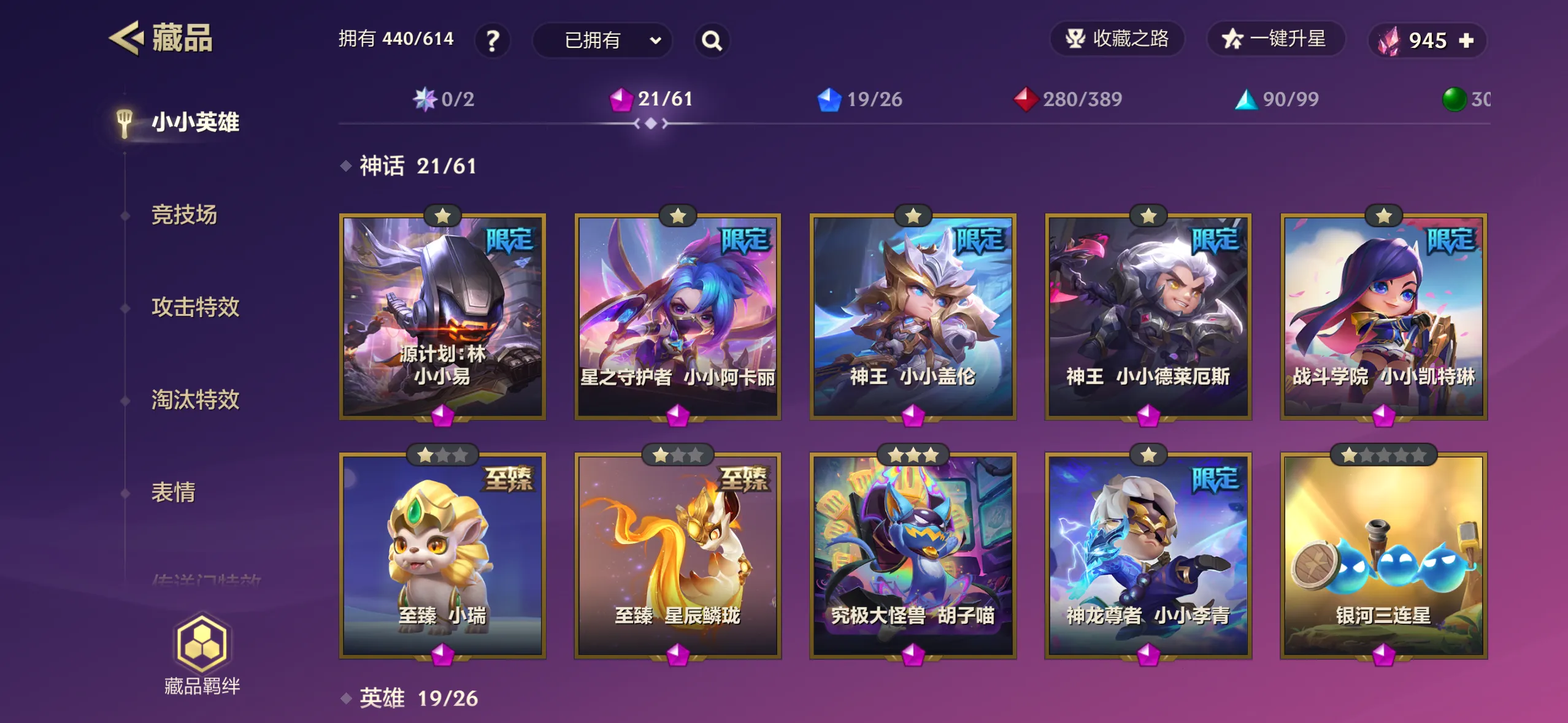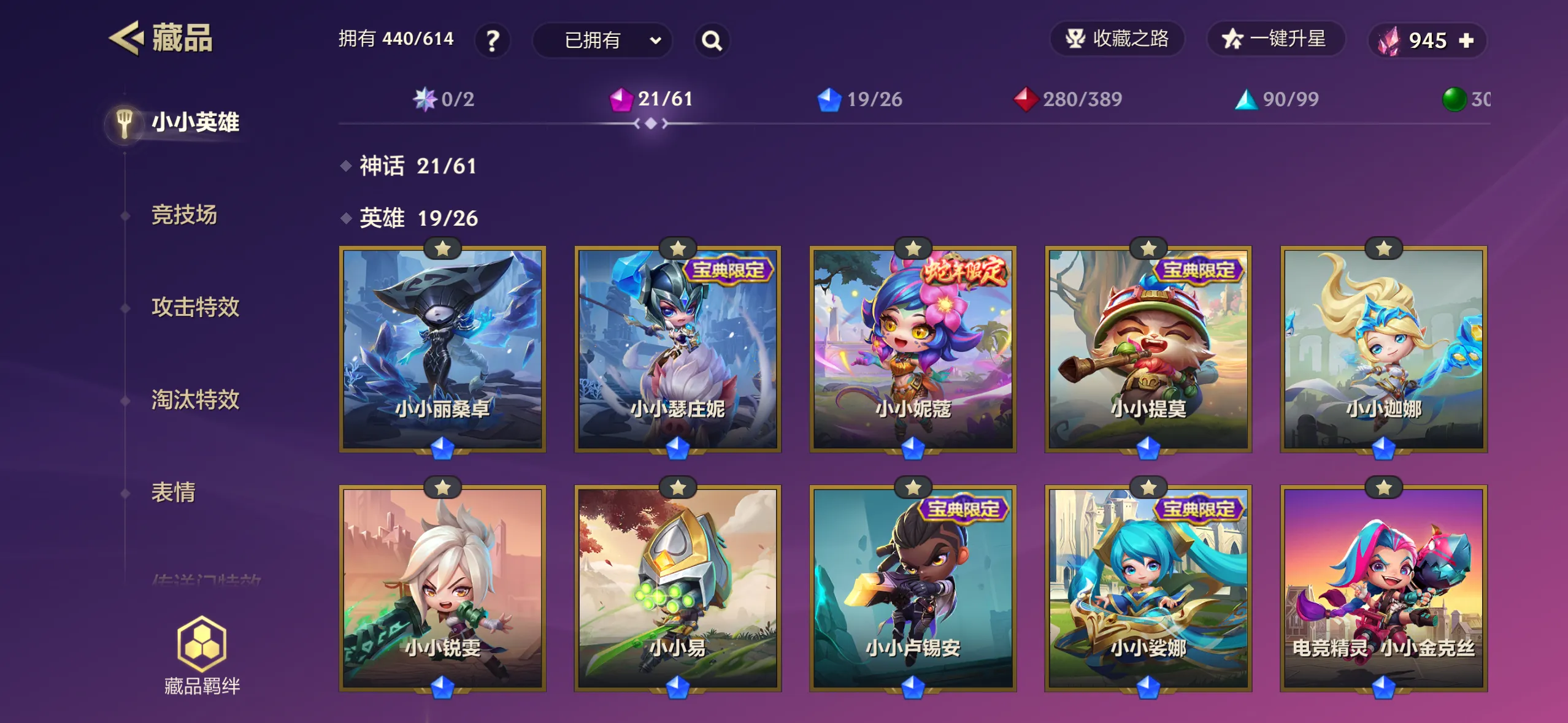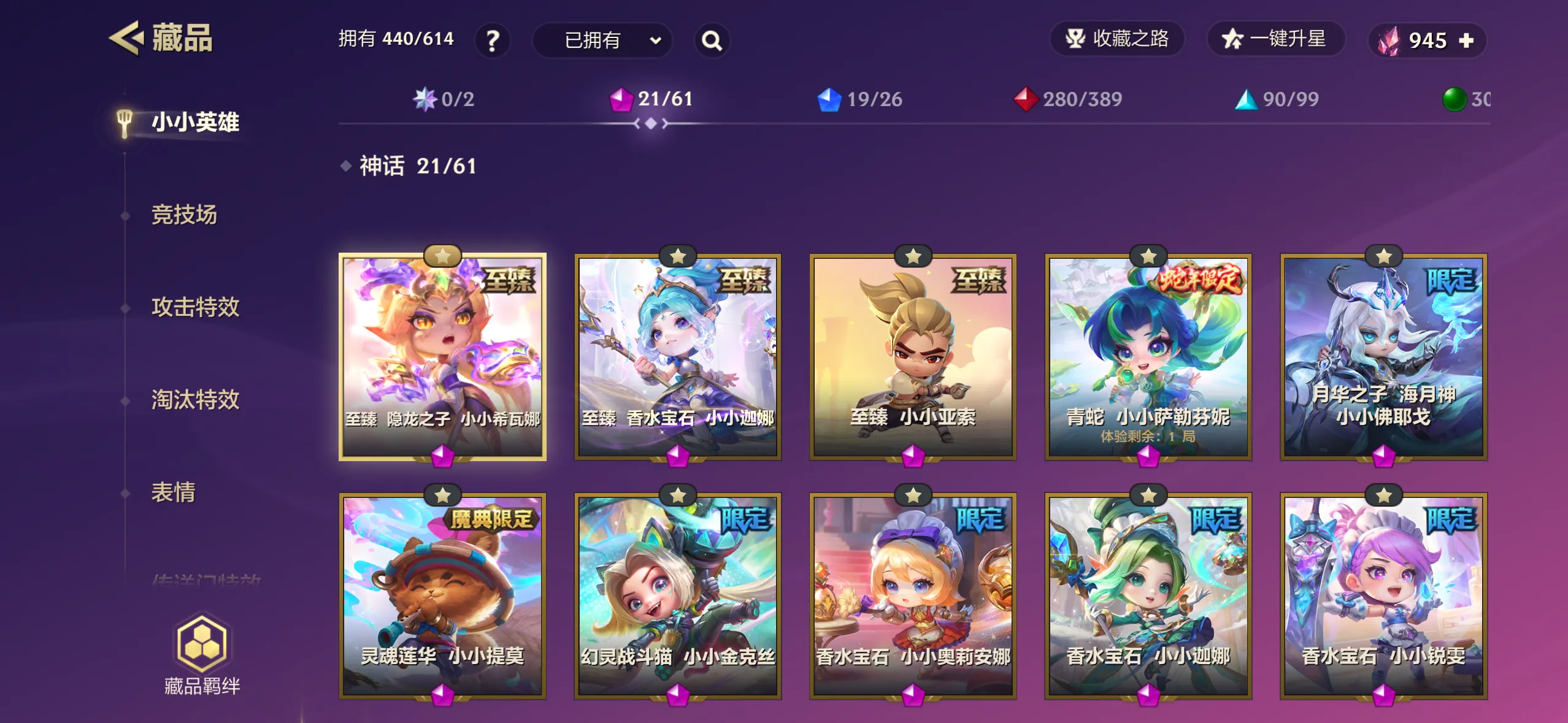 440个小小英雄/21神话/至臻龙女希瓦娜/至臻香水宝石迦娜/至臻小小亚索/38攻击特效/33棋盘