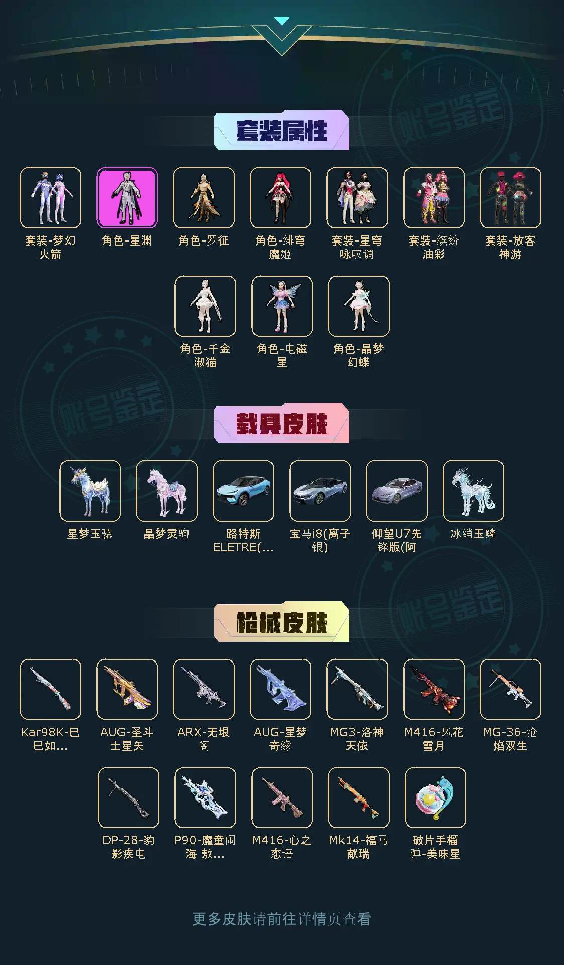 【稀有资产】角色-千金淑猫/套装-缤纷油彩/M416-心之恋语/破片手榴弹-美味星星糖/AUG-星梦奇缘/AUG-圣斗士星矢/M416-风花雪月/角色-Mark.06/套装-龟仙人/套装-晶辉守护/套装-圣穹绘梦/玩偶服-小狗蛇点点/玩偶服-喜羊羊/角色-粉雾星云/角色-摩登魅猫/角色-时希公主/角色-银尘