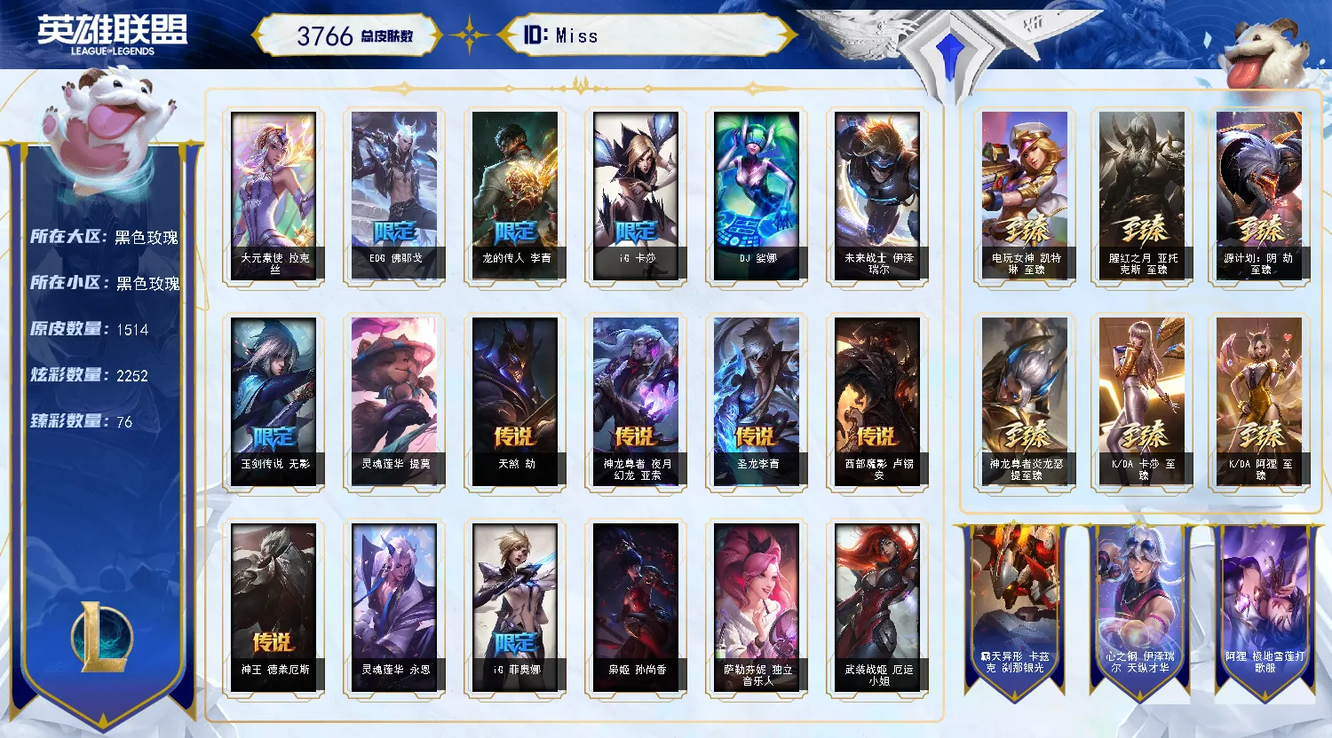 黑色玫瑰3700皮丨1514原皮丨2252炫彩丨313限定丨75臻彩丨61神话
