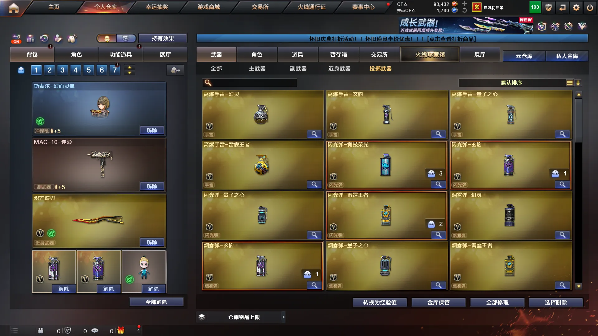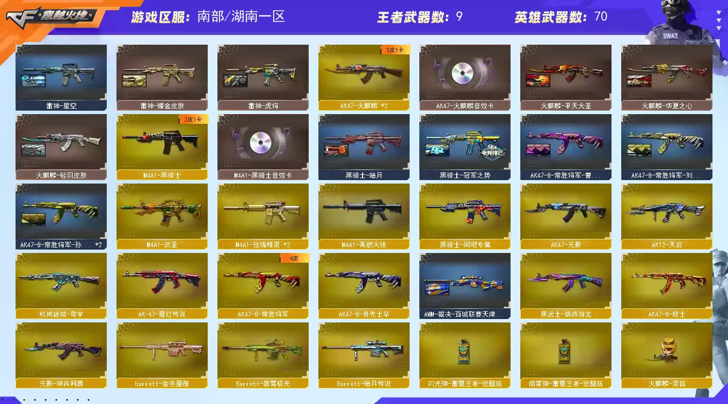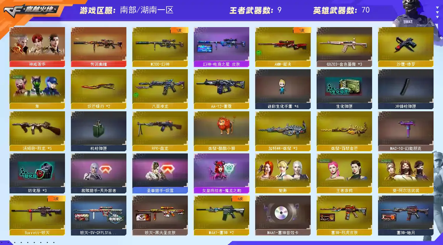 生化爆破全装、传说神威莲花四防、传说幽瞳、四防隼角色、八面玲珑、炽芒蝶刃×2、斯太尔幻面灵狐5烈龙、四炼狱、雷神音效卡等所有道具弹夹全拉满不缺样,觉得不错的给个好评收藏起来,谢谢!
