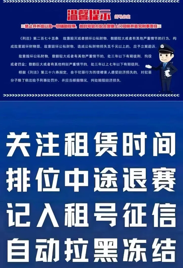 本账号因价值过高已在公安处报备,使用违规软件或器械导致游戏封禁者押金概不退还,导致账号面临严重处罚者将通过法律途径维权