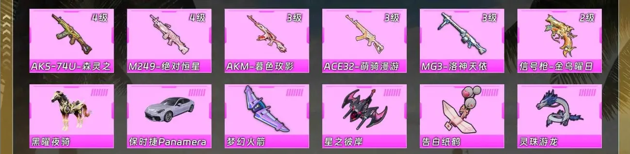 【粉色枪皮】M762-鬼刀/AMR-智耀战神/AKS-74U-星穹咏叹调/平底锅-喜羊羊与灰太狼/M762-青锋波束/SCAR-L-锦绣绵绵/AKM-绿萝繁花/Kar98K-巳巳如意/Mk14-福马献瑞/Mk14-甜梦熊击/M417-第五大道/汤姆逊-热量炸弹/UMP45-量子极限[5级]/DP-28-豹影疾电/MG-36-沧焰双生/AKS-74U-森灵之息/M249-绝对恒星/AKM-暮色玫影/ACE32-萌骑漫游/MG3-洛神天依/信号枪-金乌曜日