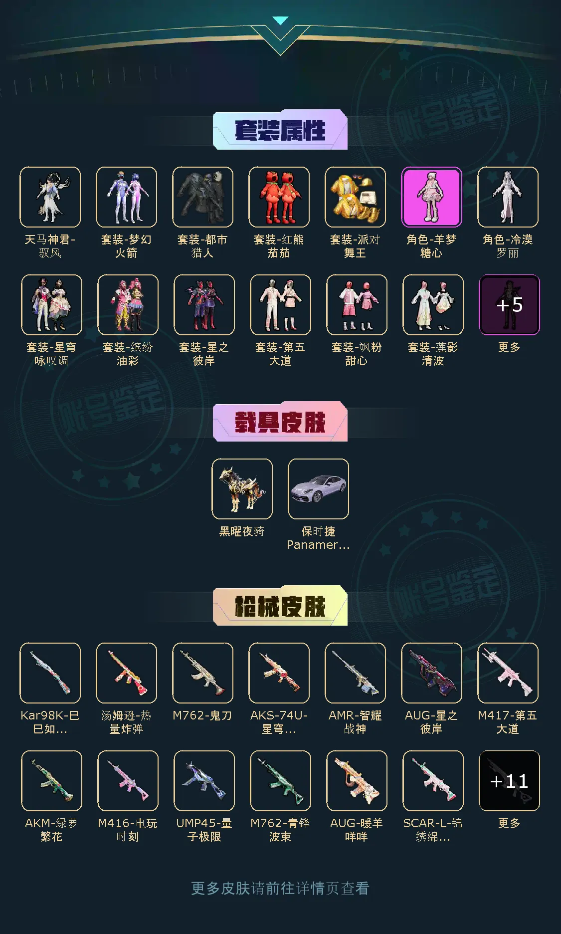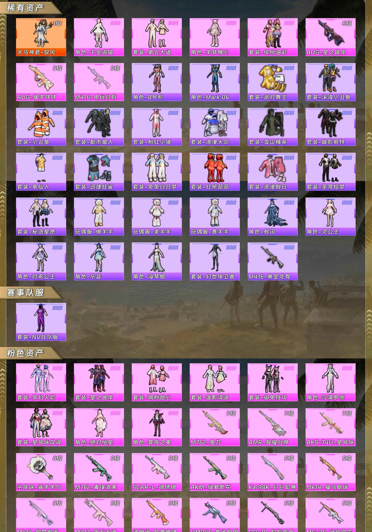 【稀有资产】天马神君-驭风[1级]/角色-千金淑猫/套装-第五大道/角色-羊梦糖心/套装-缤纷油彩/AUG-星之彼岸/AUG-暖羊咩咩/M416-电玩时刻/角色-8号机/角色-Mark.06/套装-派对舞王/套装-深海小丑鱼/套装-小丑鱼/套装-都市猎人/套装-粉红小猪/套装-浪漫天命/套装-雪山精英/套装-暗影哥特/套装-龟仙人/套装-迅捷狂鲨/套装-兔兔白日梦/套装-红熊茄茄/套装-浪漫假日/套装-圣穹绘梦/套装-秘语星愿/玩偶服-懒羊羊/玩偶服-美羊羊/玩偶服-喜羊羊/角色-敖闰/角色-灵公主/角色-时希公主/角色-乐音/角色-海琴烟/套装-幻世保卫者/M416-黄金龙骨