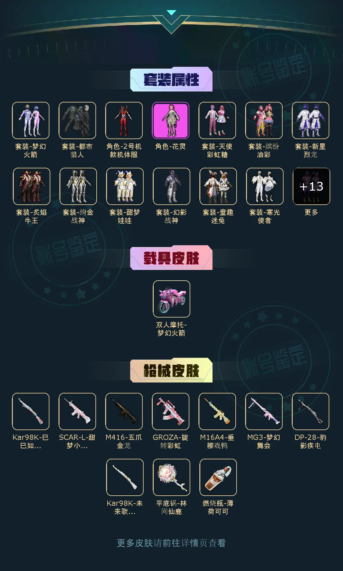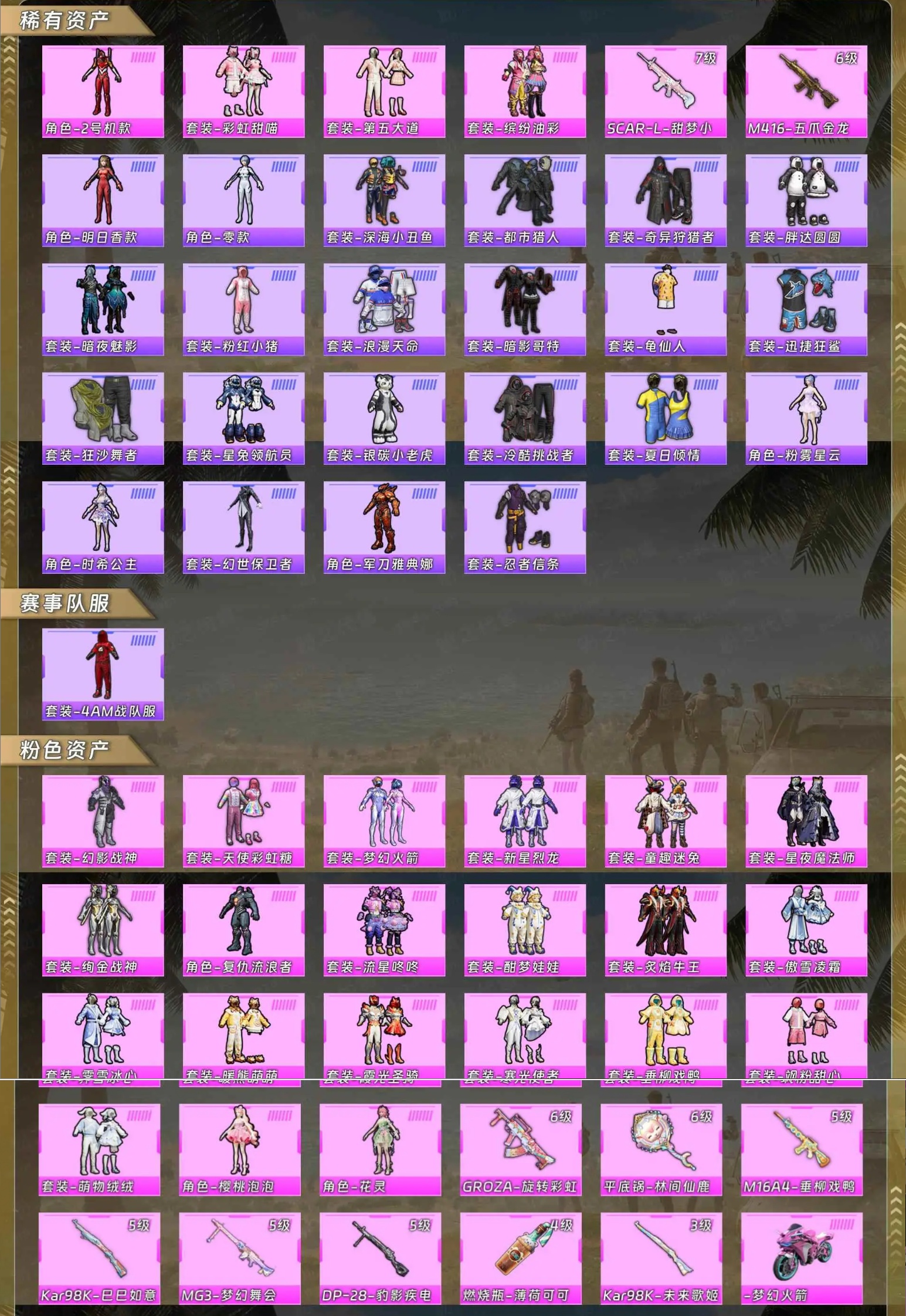 【稀有资产】角色-2号机款机体服/套装-彩虹甜喵/套装-第五大道/套装-缤纷油彩/SCAR-L-甜梦小狐/M416-五爪金龙/角色-明日香款战斗服/角色-零款战斗服/套装-深海小丑鱼/套装-都市猎人/套装-奇异狩猎者/套装-胖达圆圆/套装-暗夜魅影/套装-粉红小猪/套装-浪漫天命/套装-暗影哥特/套装-龟仙人/套装-迅捷狂鲨/套装-狂沙舞者/套装-星兔领航员/套装-银碳小老虎/套装-冷酷挑战者/套装-夏日倾情/角色-粉雾星云/角色-时希公主/套装-幻世保卫者/角色-军刀雅典娜/套装-忍者信条