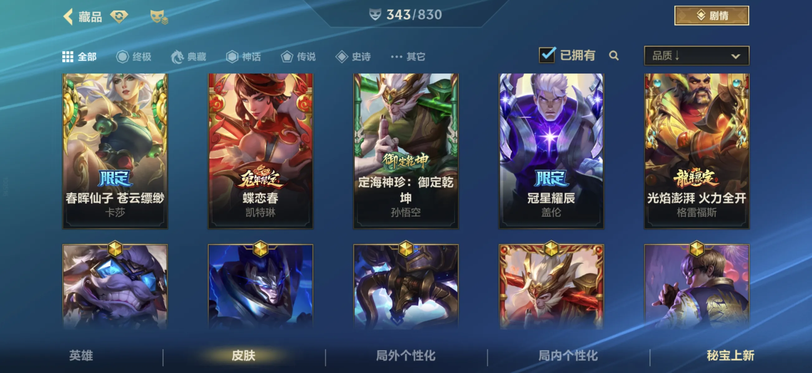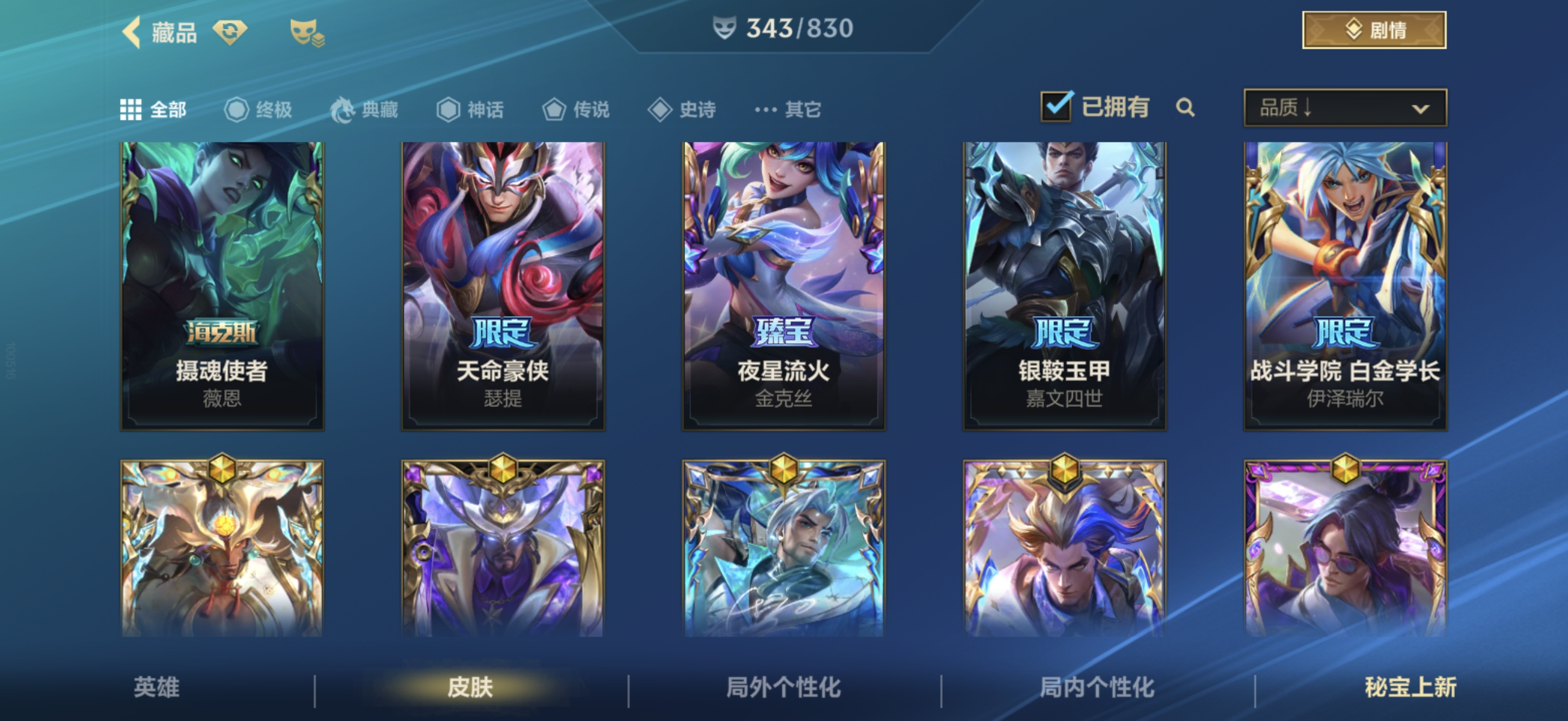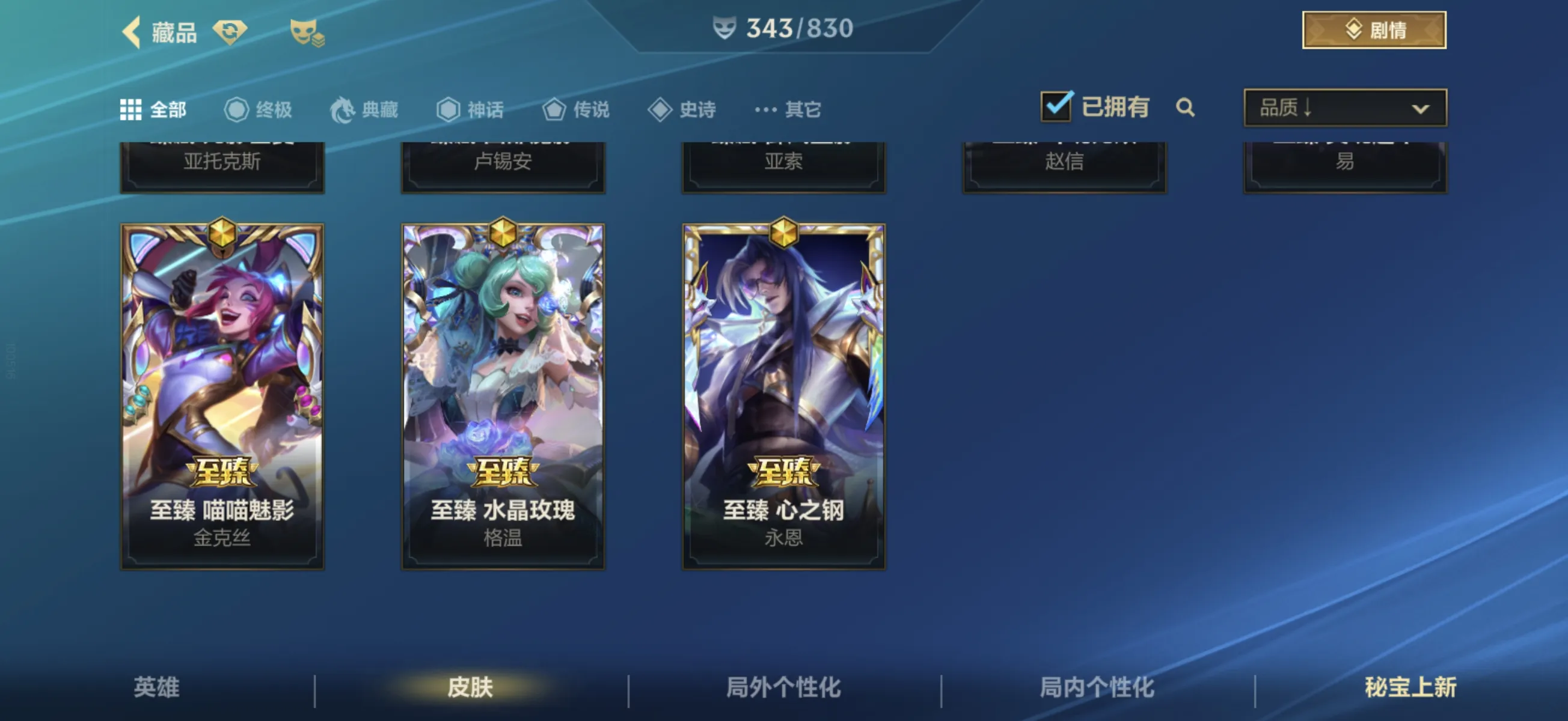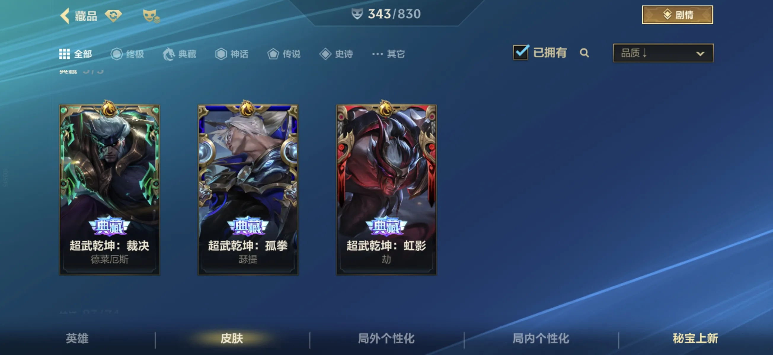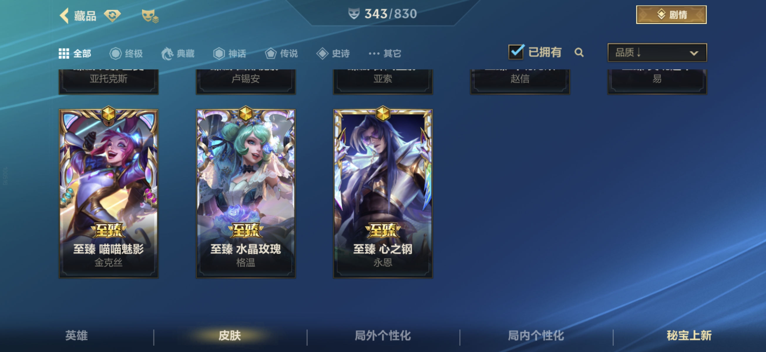 【安卓】 343皮/3典藏/23神话/超武乾坤诺手劫瑟提/臻藏御风墨影亚索臻藏西部魔影臻藏光影巨翼水晶玫瑰格温