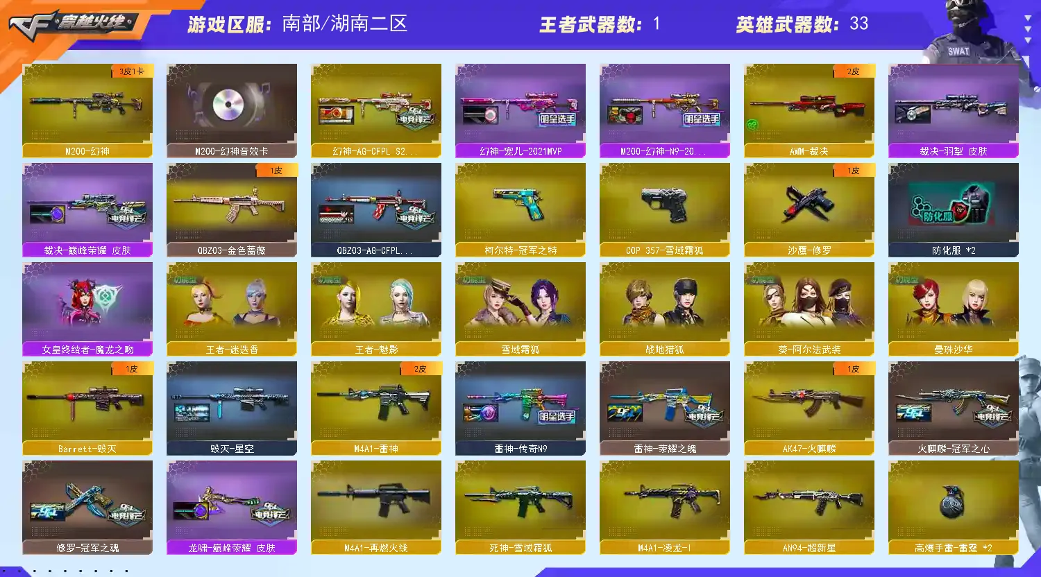 1221 南部 湖南二区 32🆚 VIP5 【可排位】【南部幻神三皮三件套】【m200幻神+AG-CFpls24冠军皮肤+宠儿-2021MVP皮肤+N9-2022MVP皮肤+幻神音效卡】【裁决+巅峰荣耀皮肤】【qbz金色蔷薇+AG-CFpls19冠军皮肤】【雷神+传奇N9皮肤+荣耀之魄皮肤+雷神怀旧音效卡】【火麒麟+冠军之心皮肤】【柯尔特-冠军之特】【觉醒王者岩刺】【荣耀世冠-龙啸】【KAC锯式机枪-黑桃战神】【加利尔ACE-零号】【火麒麟/雷神/超新星/死神雪域霜狐/qbz金色蔷薇/毁灭/裁决/幻神】【修罗/天神/cop雪域霜狐/柯尔特冠军之特】【屠龙/龙啸/麒麟刺/屠龙动感闪耀/麒麟刺百战金芒/荣耀世冠龙啸/觉醒王者岩刺】【雷霆手雷包/雷暴手雷包】【曼珠沙华/王者迷迭香/王者魅影/葵-阿尔法武装/雪域霜狐/战地猎狐】【风暴女/娟娟/龙儿/潘多拉-甜心教官/铁骑荣耀/星光/喵喵】【毒蝎-x/飞虎队-x/剑齿虎-x/精英部队-x/圣诞潘多拉-x】【永久烟雾头护目镜】【百战金芒炫彩背包/雪域霜狐炫彩背包/亚洲杯纪念炫彩背包】【幻神音效卡】【雷神怀旧音效卡】【cop雪域霜狐音效卡】【死神雪域霜狐音效卡】【碧霄极光音效卡】【幻神AG-CFpls24冠军皮肤/幻神宠儿皮肤/幻神n9皮肤】【裁决巅峰荣耀皮肤/龙啸巅峰荣耀皮肤】【金色蔷薇AG-CFpls19冠军皮肤】【雷神传奇n9皮肤/雷神荣耀之魄皮肤】【修罗冠军之魂皮肤/火麒麟冠军之心皮肤】【AC/手雷包/c4钳永久】