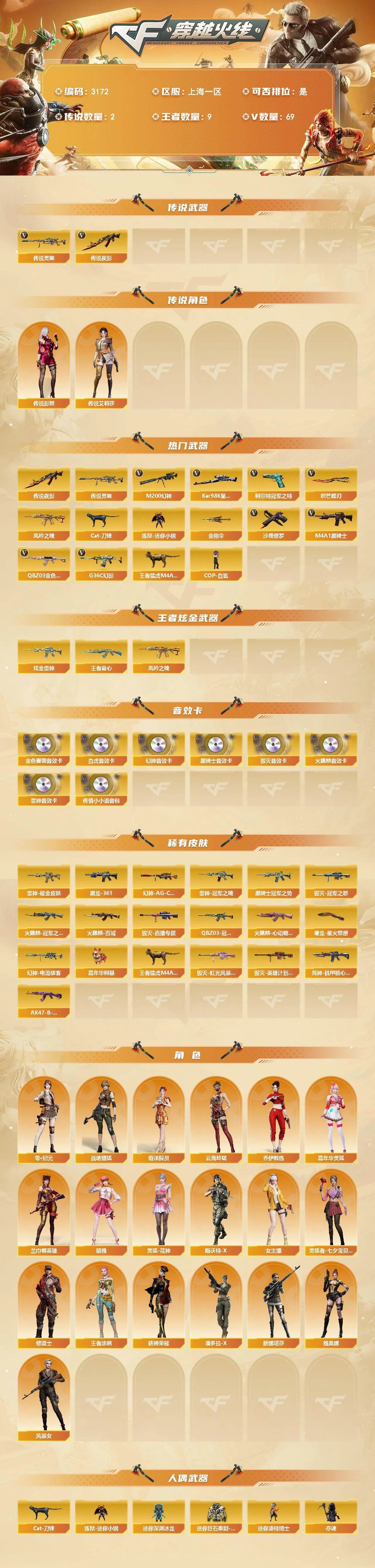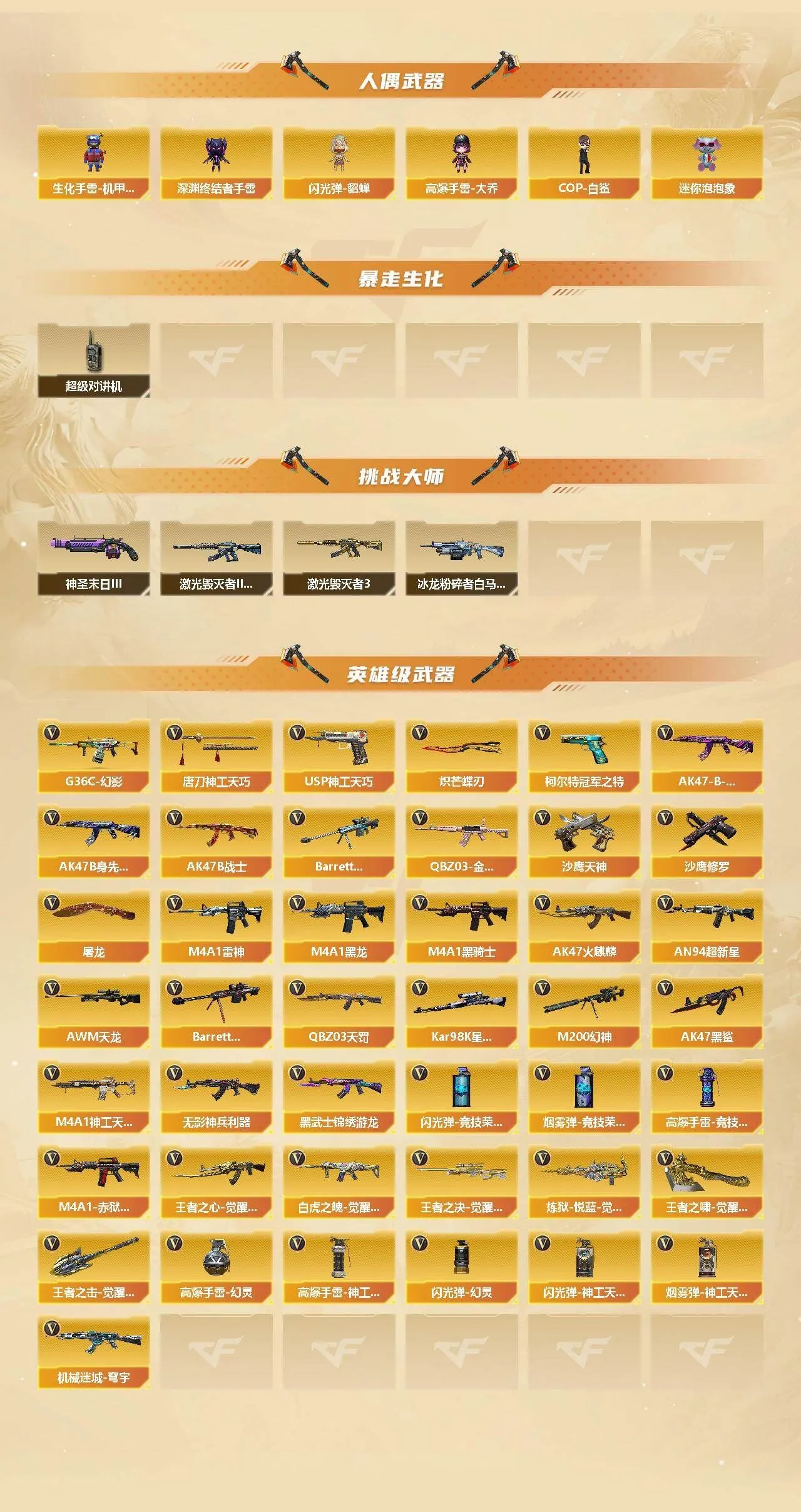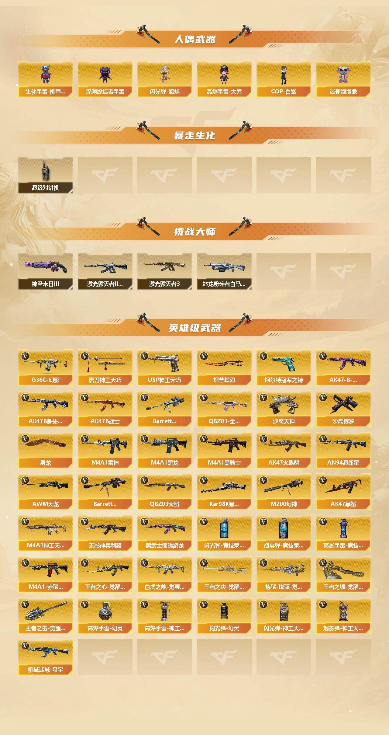 【传说武器】:传说夜影,传说灵眸【传说角色】:4防传说艾莉莎,传说影煞【热门武器】:传说夜影,传说灵眸,G36C-幻影,QBZ03-金色蔷薇,M200-幻神,凤吟之魄,柯尔特-冠军之特,Kar98K-星神,Cat-刀锋,炼狱-迷你小钢,M4A1-黑骑士*2,王者猛虎M4A1,COP-白鲨,沙鹰-修罗*3,炽芒蝶刃*3,金刚伞【王者炫金武器】:王者霜心,凤吟之魄,炫金雷神【音效卡】:M200-幻神音效卡,AK47-火麒麟音效卡,M4A1-雷神音效卡,M4A1-黑骑士音效卡,Barrett-毁灭音效卡,QBZ03-金色蔷薇音效卡,Scar Light-白虎音效卡,传情小小语音包【皮肤】:幻神-AG-CFPLS17冠军,幻神-电流骇客 皮肤,QBZ03-冠军之薇,QBZ03-嘉年华柯基,雷神-耀金皮肤,雷神-冠军之魄,王者猛虎M4A1,火麒麟-冠军之心,火麒麟-百城,火麒麟-心动糖果,毁灭-冠军之怒,毁灭-直播专属,毁灭-虹光风暴 皮肤,毁灭-英雄计划 皮肤,M4A1-黑龙-361,黑骑士-冠军之势,死神-机甲核心皮肤,AK47-B-常胜将军-曹操*2,屠龙-星火燎原【角色】:兰-巾帼英雄,晴雅,零·纪元,战地猎狐,4防王者涂鸦,奇洋探员,乔伊教练,修道士,云海玲珑,风暴女,嘉年华灵狐,灵狐-花神,灵狐者-七夕宝贝,女主播,潘多拉-X,斯沃特-X,铁骑荣耀,新娜塔莎,雅典娜【人偶武器】:COP-白鲨,炼狱-迷你小钢,迷你泡泡象,Cat-刀锋,迷你深渊冰龙,迷你波特博士,夺魂,生化手雷-机甲核心,深渊终结者手雷,闪光弹-貂蝉,高爆手雷-大乔,迷你巨石泰坦-魔花研究所【暴走生化】:超级对讲机【挑战大师】:冰龙粉碎者-白马银枪,激光毁灭者III-白马银枪,激光毁灭者III,神圣爆裂者-末日III【英雄级武器】:AK47-火麒麟*2,M4A1-黑龙,M4A1-雷神*2,M4A1-黑骑士*2,AN94-超新星,AK47-黑鲨,QBZ03-天罚,M4A1-神工天巧,无影-神兵利器,G36C-幻影,黑武士-锦绣游龙,QBZ03-金色蔷薇,王者之心-觉醒版,AK47-B-常胜将军,白虎之魄-觉醒版,机械迷城-穹宇,AK47-B-身先士卒,AK47-B-战士,AWM-天龙,Barrett-毁灭*2,M200-幻神,Kar98K-星神,王者之决-觉醒版,Barrett-暗月传说,炼狱-悦蓝-觉醒版,沙鹰-修罗*3,沙鹰-天神*3,柯尔特-冠军之特,USP-神工天巧*2,屠龙,炽芒蝶刃*3,唐刀-神工天巧,王者之啸-觉醒版,王者之击-觉醒版,高爆手雷-幻灵*2,高爆手雷-竞技荣光*2,高爆手雷-神工天巧*5,闪光弹-幻灵*2,闪光弹-竞技荣光,闪光弹-神工天巧*5,烟雾弹-竞技荣光,烟雾弹-神工天巧*5,M4A1-赤狱骑士【源级武器】:源·火麒麟,AK47-火麒麟-猫爪,源·雷神,源·黑骑士,御·黑骑士·哪吒闹海,源-金色蔷薇,魂·QBZ03-金色蔷薇-古蛇迷踪,QBZ03-文殊坊,源·毁灭,灵·Barrett-朱雀-炫光,魂·炼狱-电子连击,魂·炼狱-月*2,加特林-炼狱-掌火,灵·天神-穹宇,魂·屠龙-春桃,灵·麒麟刺-穹宇【道具】:AG战队炫彩背包,BS战队炫彩背包,CFS限定背包,全能枪王背包,奇洋探员-海龟背包,超级背包,救世主-黑桃战神,变异宝贝,生化弹匣,夺命之镰,防化服*2,金色流光-枪王排位*2,星辰流光-枪王排位,巅峰赛先锋-金色流光,枪王排位28赛季金色流光,枪王排位29赛季金色流光,电玩兔兔表情,斯沃特表情,循环实验表情,动感闪耀表情,EP战队收纳包,EP战队名片,EP战队喷图,EP战队击杀图标,防弹头盔*4,防弹衣*4,C4工具钳*3,手雷包*3【特殊枪械】:2黑骑士