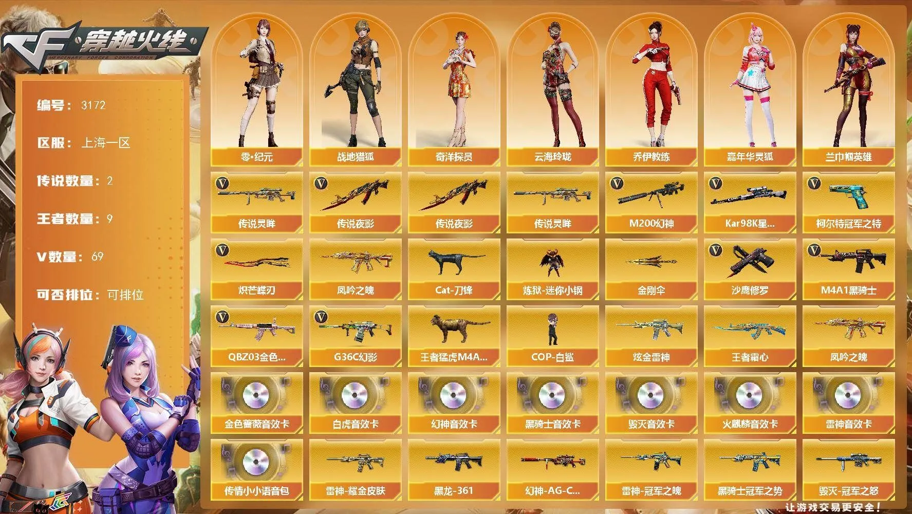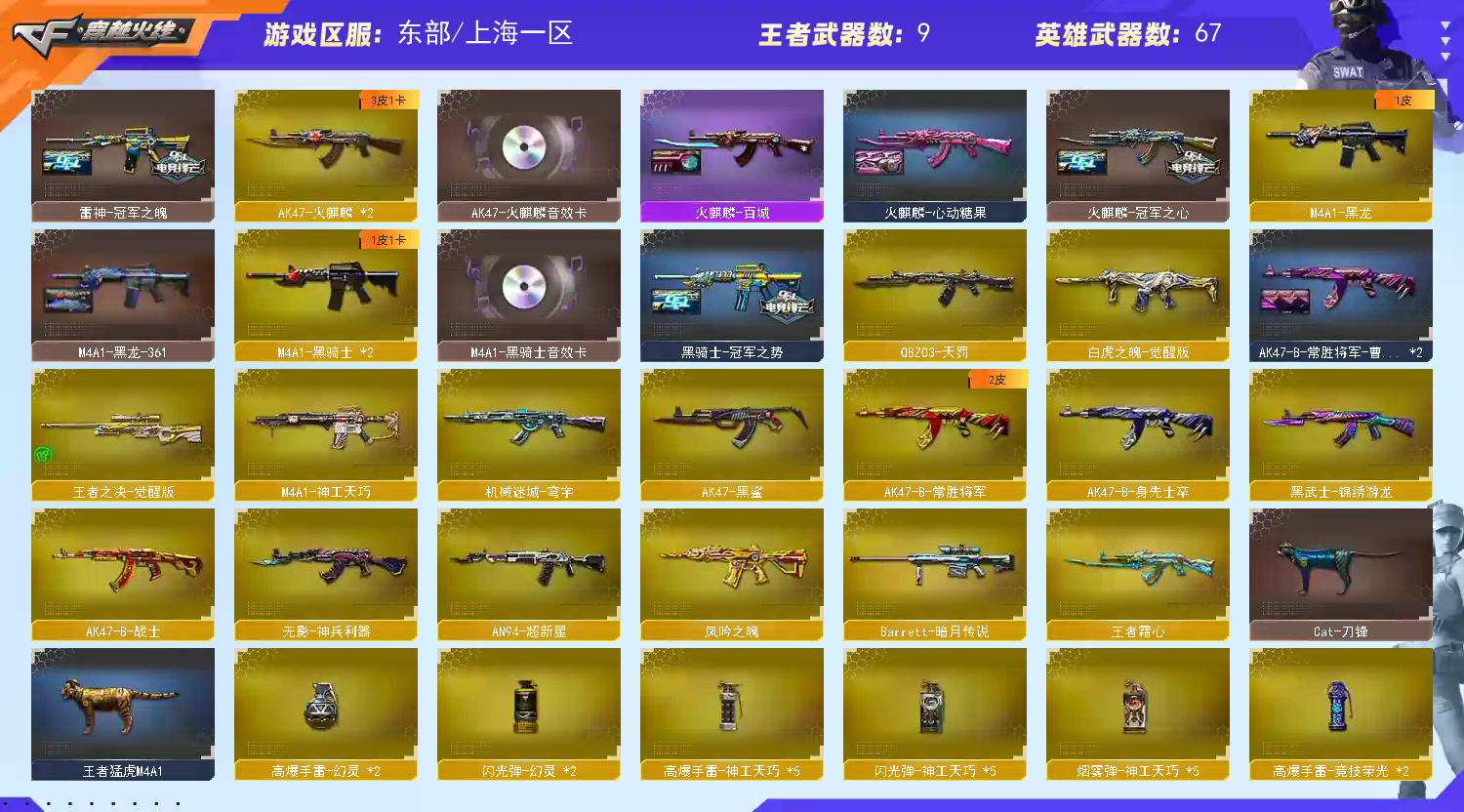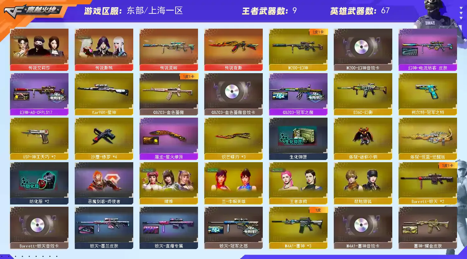 【传说武器】:传说夜影,传说灵眸【传说角色】:4防传说艾莉莎,传说影煞【热门武器】:传说夜影,传说灵眸,G36C-幻影,QBZ03-金色蔷薇,M200-幻神,凤吟之魄,柯尔特-冠军之特,Kar98K-星神,Cat-刀锋,炼狱-迷你小钢,M4A1-黑骑士*2,王者猛虎M4A1,COP-白鲨,沙鹰-修罗*3,炽芒蝶刃*3,金刚伞【王者炫金武器】:王者霜心,凤吟之魄,炫金雷神【音效卡】:M200-幻神音效卡,AK47-火麒麟音效卡,M4A1-雷神音效卡,M4A1-黑骑士音效卡,Barrett-毁灭音效卡,QBZ03-金色蔷薇音效卡,Scar Light-白虎音效卡,传情小小语音包【皮肤】:幻神-AG-CFPLS17冠军,幻神-电流骇客 皮肤,QBZ03-冠军之薇,QBZ03-嘉年华柯基,雷神-耀金皮肤,雷神-冠军之魄,王者猛虎M4A1,火麒麟-冠军之心,火麒麟-百城,火麒麟-心动糖果,毁灭-冠军之怒,毁灭-直播专属,毁灭-虹光风暴 皮肤,毁灭-英雄计划 皮肤,M4A1-黑龙-361,黑骑士-冠军之势,死神-机甲核心皮肤,AK47-B-常胜将军-曹操*2,屠龙-星火燎原【角色】:兰-巾帼英雄,晴雅,零·纪元,战地猎狐,4防王者涂鸦,奇洋探员,乔伊教练,修道士,云海玲珑,风暴女,嘉年华灵狐,灵狐-花神,灵狐者-七夕宝贝,女主播,潘多拉-X,斯沃特-X,铁骑荣耀,新娜塔莎,雅典娜【人偶武器】:COP-白鲨,炼狱-迷你小钢,迷你泡泡象,Cat-刀锋,迷你深渊冰龙,迷你波特博士,夺魂,生化手雷-机甲核心,深渊终结者手雷,闪光弹-貂蝉,高爆手雷-大乔,迷你巨石泰坦-魔花研究所【暴走生化】:超级对讲机【挑战大师】:冰龙粉碎者-白马银枪,激光毁灭者III-白马银枪,激光毁灭者III,神圣爆裂者-末日III【英雄级武器】:AK47-火麒麟*2,M4A1-黑龙,M4A1-雷神*2,M4A1-黑骑士*2,AN94-超新星,AK47-黑鲨,QBZ03-天罚,M4A1-神工天巧,无影-神兵利器,G36C-幻影,黑武士-锦绣游龙,QBZ03-金色蔷薇,王者之心-觉醒版,AK47-B-常胜将军,白虎之魄-觉醒版,机械迷城-穹宇,AK47-B-身先士卒,AK47-B-战士,AWM-天龙,Barrett-毁灭*2,M200-幻神,Kar98K-星神,王者之决-觉醒版,Barrett-暗月传说,炼狱-悦蓝-觉醒版,沙鹰-修罗*3,沙鹰-天神*3,柯尔特-冠军之特,USP-神工天巧*2,屠龙,炽芒蝶刃*3,唐刀-神工天巧,王者之啸-觉醒版,王者之击-觉醒版,高爆手雷-幻灵*2,高爆手雷-竞技荣光*2,高爆手雷-神工天巧*5,闪光弹-幻灵*2,闪光弹-竞技荣光,闪光弹-神工天巧*5,烟雾弹-竞技荣光,烟雾弹-神工天巧*5,M4A1-赤狱骑士【源级武器】:源·火麒麟,AK47-火麒麟-猫爪,源·雷神,源·黑骑士,御·黑骑士·哪吒闹海,源-金色蔷薇,魂·QBZ03-金色蔷薇-古蛇迷踪,QBZ03-文殊坊,源·毁灭,灵·Barrett-朱雀-炫光,魂·炼狱-电子连击,魂·炼狱-月*2,加特林-炼狱-掌火,灵·天神-穹宇,魂·屠龙-春桃,灵·麒麟刺-穹宇【道具】:AG战队炫彩背包,BS战队炫彩背包,CFS限定背包,全能枪王背包,奇洋探员-海龟背包,超级背包,救世主-黑桃战神,变异宝贝,生化弹匣,夺命之镰,防化服*2,金色流光-枪王排位*2,星辰流光-枪王排位,巅峰赛先锋-金色流光,枪王排位28赛季金色流光,枪王排位29赛季金色流光,电玩兔兔表情,斯沃特表情,循环实验表情,动感闪耀表情,EP战队收纳包,EP战队名片,EP战队喷图,EP战队击杀图标,防弹头盔*4,防弹衣*4,C4工具钳*3,手雷包*3【特殊枪械】:2黑骑士