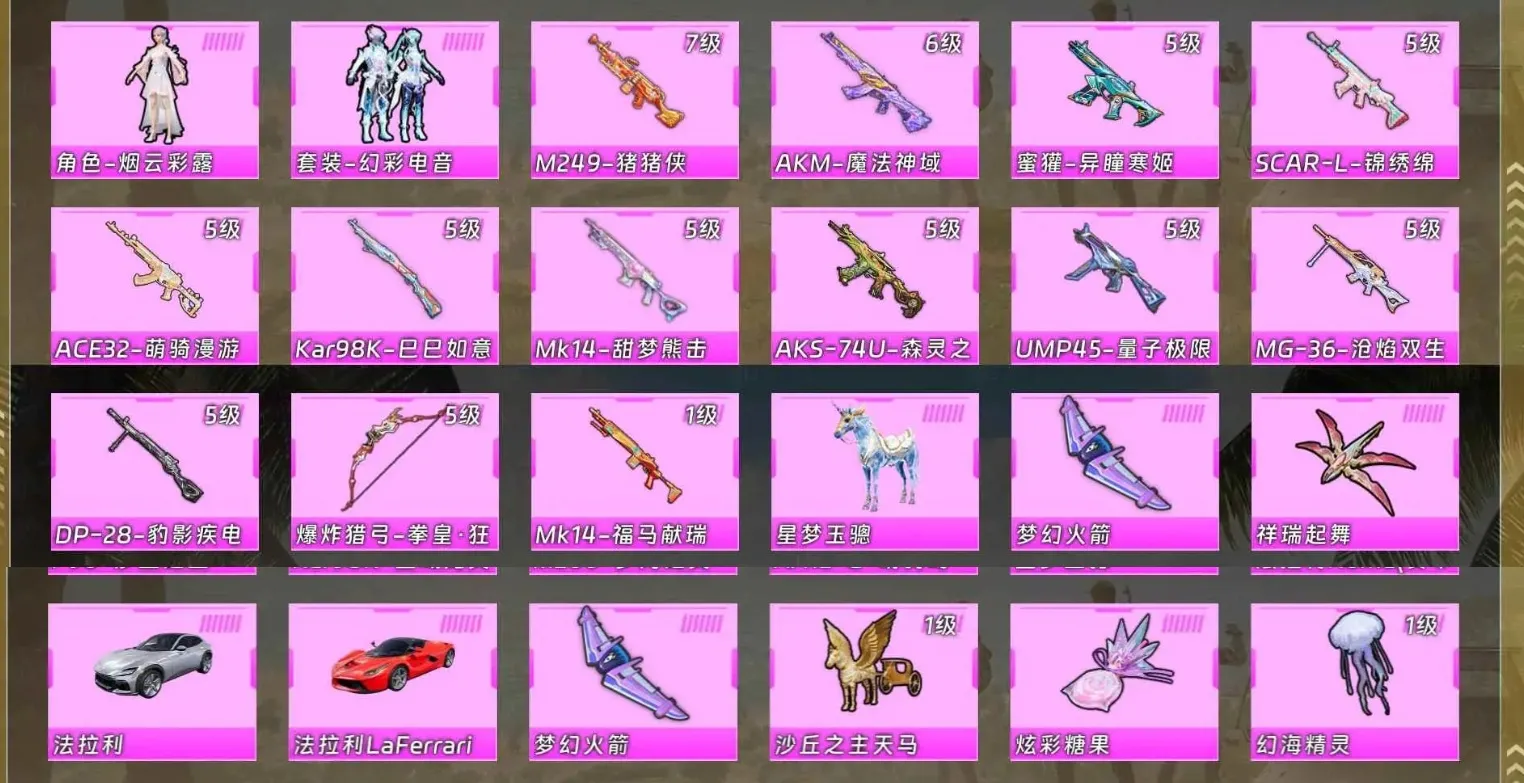 【粉色枪皮】Mk14-爆裂游戏/SCAR-L-梦幻火箭/Kar98K-巳巳如意/Mk14-福马献瑞/Vector-环太平洋/AKS-74U-森灵之息/MG-36-沧焰双生/DP-28-豹影疾电/破片手榴弹-瓶中星球/燃烧瓶-薄荷可可/MG3-洛神天依/M338-回旋牧梦使/烟雾弹-猫咪绅士/P90-沙丘之主/Kar98K-圣域龙灵/M200-梦海之灵/AA12-G-萌骑幻想