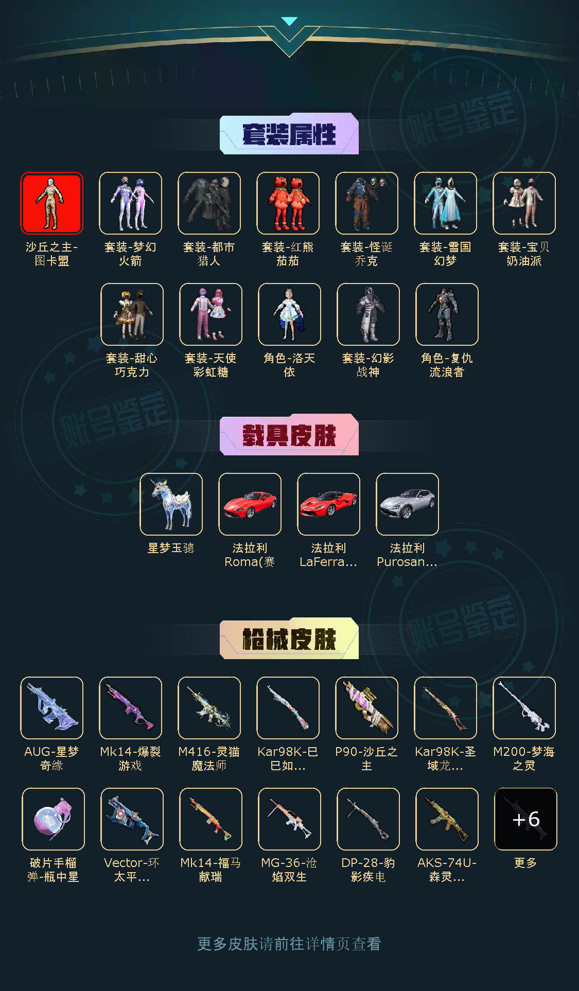 【稀有资产】沙丘之主-图卡盟[2级]/套装-雪国幻梦/套装-怪诞乔克/套装-梦幻火箭/套装-甜心巧克力/AUG-星梦奇缘/M416-灵猫魔法师/小丑红鼻头/套装-深海小丑鱼/套装-都市猎人/套装-奇异狩猎者/套装-胖达圆圆/套装-浪漫天命/套装-暗影哥特/套装-晶辉守护/套装-红熊茄茄/套装-狂沙舞者/角色-粉雾星云/套装-金羽特工/角色-军刀雅典娜/套装-忍者信条/角色-唐三/套装-激萌罗小黑